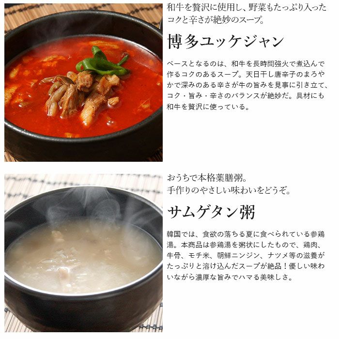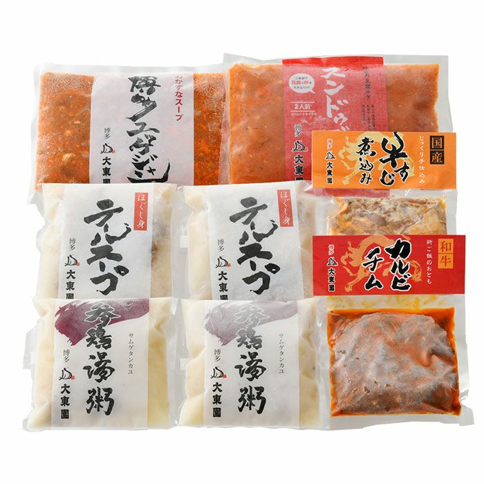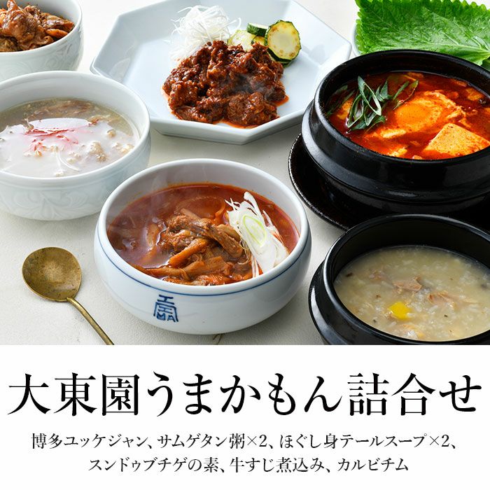 他の画像を見る 大東園うまかもん詰合せ やさしくも旨辛な本格韓国料理はどれも百点満点! 大東園うまかもん詰め合せ 販売価格 ¥ 9,600 税込 博多の老舗焼肉店の人気者が一堂に。和牛の旨み溢れるユッケジャン、滋味豊かなサムゲタン粥にテールスープ、甘辛味でご飯が進む黒毛和牛のカルビチムなど6品。どれも家庭では作れない奥深い味わいに圧倒される。年末年始の集いに重宝すること間違いなし! 詳細を見る お気に入りに登録する