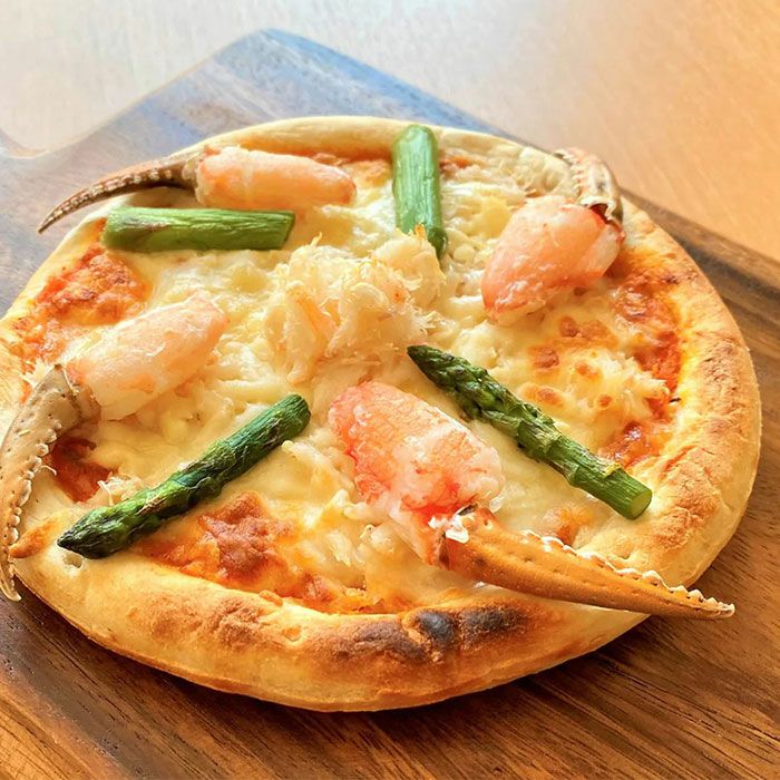贅沢ピザは、「まるずわいがに」をふんだんに使ったソース、そしてほぐし身、一本爪を惜しみなく贅沢にトッピングいたしました。ピザの34%が「まるずわいがに」で占められています。どこから食べても、蟹を感じられる一品です。 白色のかにグラタンは、じっくり丁寧に手作りしたベシャメルソースに、コロコロとしたかわいらしいかにの実をトッピングしています。蟹の味を引き立たせるシンプルな味付けで、子供から大人まで愛される定番メニューの自慢のグラタンです。 海と森パスタ(えびとほうれん草)は手作りソースと、ごろっと具材入りでボリュームある冷凍パスタです。電子レンジで約5分、簡単に調理しお召し上がりいただけます。