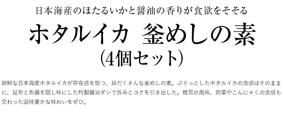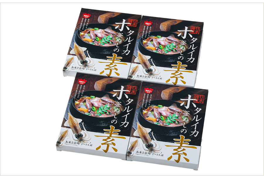 ○名称:炊き込みご飯の素 ○内容量:230g×4箱 ○原材料名:ホタルイカ(日本海産)、にんじん、ひらたけ、清酒、椎茸、こんにゃく、食塩、砂糖、味醂、醤油(大豆・小麦を含む)、昆布エキス、魚醤/調味料(アミノ酸等)、水酸化カルシウム ○配送形態:常温 (宅配BOX・置配不可) ○保存方法:常温 ○賞味期限:製造日より常温545日 ○熨斗:不可 ○名入れ:不可 ○包装:不可 ○手提げ:不可 ○荷姿:ダンボール ○備考:商品1個:重量230g、商品1個サイズ:19.0×14.0×2.0(cm)、商品4個セットサイズ:縦30.0×横18.0×高さ8.5(cm) ○販売者:【かね七株式会社】 〒939-3521 富山県富山市水橋畠等297 ○製造者:【宝食品株式会社】 〒761-4421 香川県小豆郡小豆島町苗羽甲2226-15