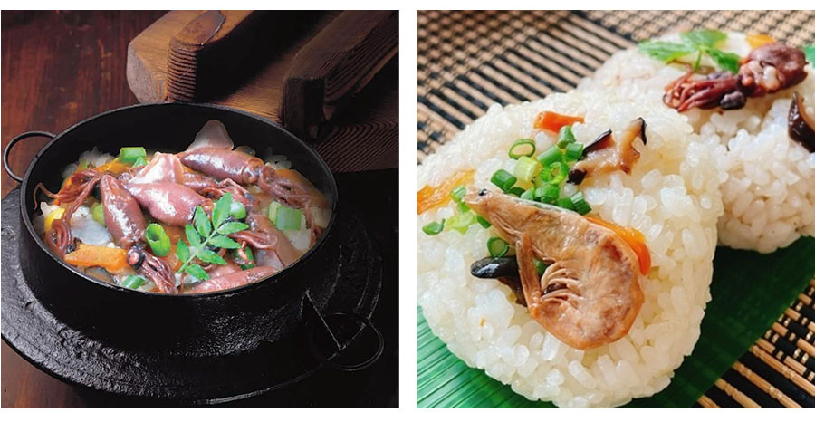 新鮮な日本海産ホタルイカが存在感を放つ、具だくさんな釜めしの素。ぷりっとしたホタルイカの食感はそのままに、昆布と魚醤を隠し味にした特製醤油ダシで旨みとコクを引き出した。椎茸の風味、野菜やこんにゃくの食感も交わった滋味豊かな味わいをぜひ。