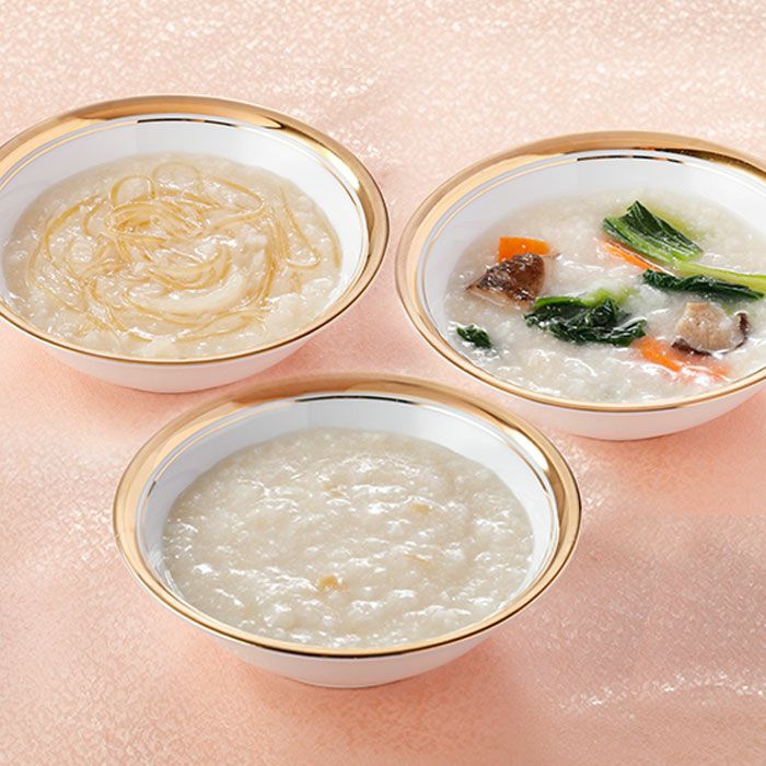 【中華おかゆ】国産のお米を使用。味付けには、陳建一監修の高級中華スープの素「美味湯(メイウェイタン)」を使用し、旨味のベースを作りシェンタンと呼ばれるアヒルの塩漬け卵と干し貝柱でコクを出しています。湯葉を加えることでさりげないアクセントも加えてあります。 【野菜がゆ】おかゆ特有のトロッとしていながらもさらりと食べられる食感になるよう、しっかり煮込んでいます。中華がゆの美味しさに、チンゲン菜、にんじん、しいたけを大きめにカットし、食べごたえがあるおかゆです。 【ふかひれ入りがゆ】おかゆ特有のトロッとしていながらも、ペロリと気軽に食べられる食感になるよう、じっくり煮込んでいます。ベースにふかひれの美味しさとオイスターソースのコクを加えた、ワンランク上のおかゆです。