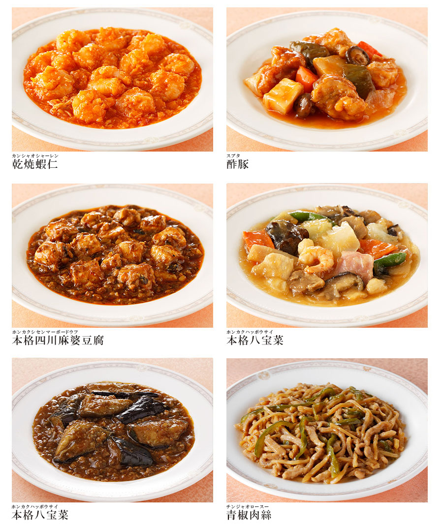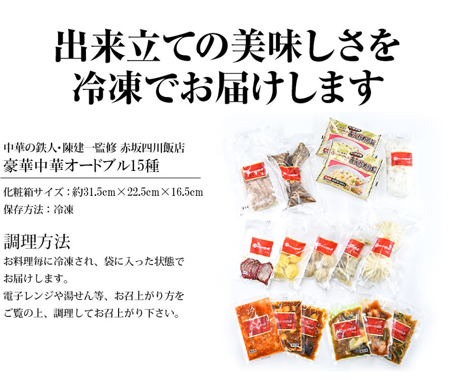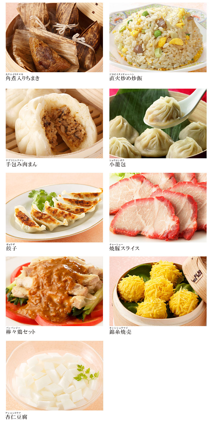 ○名称:オードブルセット ○内容量: ・直火炒め炒飯200g×2食 ・小籠包4個入140g ・錦糸焼売5個入125g ・餃子6個入120g ・乾焼蝦仁150g ・角煮入りちまき4個入240g ・本格四川麻婆豆腐150g ・酢豚150g ・本格八宝菜150g ・青椒肉絲150g ・焼豚スライス100g ・麻婆茄子150g ・棒々鶏セット150g ・手包み肉まん2個入240g ・杏仁豆腐500g×各1P ○原材料名: 【直火炒め炒飯200g】精白米(国産)、炒り玉子、野菜(ねぎ、グリンピース)、豚肉、しょうゆ、液卵、豚脂、清酒、食塩、中華スープの素、おろし生姜、砂糖、ショートニング、XO醤、香辛料、でん粉、いため油(なたね油、ショートニング)/調味料(アミノ酸等)、加工でん粉、増粘多糖類、乳化剤、pH調整剤、カロチノイド色素、(一部に卵・小麦・乳成分・えび・ごま・大豆・鶏肉・豚肉を含む) 【小籠包(4個入)140g】豚肉(輸入)、ゼラチン、しょう油、砂糖、オイスターソース、ごま油、チキンコンソメ、しょうが、長ねぎ、香辛料、皮(小麦粉、でん粉、砂糖、ラード、植物油)/調味料(アミノ酸等)、カラメル色素、(一部に小麦・乳成分・大豆・牛肉・豚肉・鶏肉・ごま・ゼラチンを含む) 【錦糸焼売(5個入)125g】魚肉[いとより(タイ産)、いか]、玉ねぎ、豚脂、大豆油、みりん、くわい、しょう油、やまいも、でん粉、卵、こんぶ茶、食塩、皮(卵、小麦粉、砂糖、食塩、植物油脂、米醸造調味料)/ソルビトール、カロチノイド色素、調味料(アミノ酸等)、甘味料(カンゾウ)、(一部に小麦・卵・いか・大豆・豚肉・やまいもを含む) 【餃子6個入120g】野菜[キャベツ(国産)、白菜、にら、長ねぎ、にんにく、しょうが、玉ねぎ]、豚肉、ラード、豚脂、粒状大豆たん白、オイスターソース、植物油(ごま油、大豆油)、しょう油、チキンパウダー、でん粉、味噌、昆布茶、ゼラチン、砂糖、食塩、香辛料、焼酎、皮(小麦粉、還元水飴、大豆油、こんにゃく粉)/酒精、トレハロース、調味料(アミノ酸等)、重曹、カラメル色素、香料、酸味料、(一部に小麦・豚肉・大豆・ごま・鶏肉・ゼラチンを含む) 【乾焼蝦仁150g】えび(輸入)、トマトケチャップ、野菜(トマト、ねぎ、しょうが、にんにく)、大豆油、卵、砂糖、でんぷん、豆板醤、小麦粉、酒、チューニャン(もち米、酒、米こうじ、砂糖)、ポーク・チキンエキス、食塩、醸造酢、香辛料、しょう油、脱脂粉乳、揚げ油(大豆油)/増粘剤(加工デンプン、増粘多糖類)、調味料(アミノ酸等)、ベーキングパウダー、酸味料、(一部に小麦・卵・乳成分・えび・大豆・豚肉・鶏肉を含む) 【角煮入りちまき(4個入)240g】もち米(国産)、豚肉、しいたけ、しょう油、ねぎ油、ラード、干しえび、干しだいこん、中国醤油、揚げねぎ、ごま油、大豆油、砂糖、食塩、にんにく、しょうが、香辛料/調味料(アミノ酸等)、(一部に小麦・えび・大豆・豚肉・ごまを含む) 【本格四川麻婆豆腐150g】冷凍豆腐[大豆(国産)、でん粉]、大豆油、豚肉、清酒、長ねぎ、豆板醤、しょう油、ポーク・チキンエキス、香辛料、トウチ、砂糖、チキンパウダー、味噌、にんにく、オイスターソース、しょうが/糊料(加工デンプン)、調味料(アミノ酸等)、酸化防止剤(ビタミンE)、凝固剤(塩化マグネシウム)、カラメル色素、酸味料、香料、(一部に小麦・大豆・豚肉・鶏肉・りんごを含む) 【酢豚150g】野菜[たまねぎ、にんじん、たけのこ、ピーマン]、豚肉(国産)、砂糖、トマトケチャップ、しいたけ、しょう油、でん粉、醸造酢、小麦粉、酒、食塩、卵、香辛料、揚げ油(大豆油)/増粘剤(加工デンプン、増粘多糖類)、酸味料、調味料(アミノ酸等)、ベーキングパウダー、(一部に小麦・卵・大豆・豚肉を含む) 【本格八宝菜150g】魚介類(イタヤ貝、えび、いか)、野菜[白菜(国産)、いんげん、たけのこ、にんじん]、豚肉、きくらげ、ポーク・チキンエキス、マッシュルーム、ふくろたけ、大豆油、清酒、ハム、しいたけ、コーンスターチ、醤油、食塩、オイスターソース、香味油、砂糖、中国醤油、チキンパウダー、香辛料/増粘剤(加工デンプン)、調味料(アミノ酸等)、着色料(コチニール、ラック、カラメル)、香料、酸味料、発色剤(亜硝酸Na、硝酸K)、(一部に小麦・卵・乳成分・えび・大豆・豚肉・いか・鶏肉・りんごを含む) 【青椒肉絲150g】野菜(たけのこ、ピーマン)、豚肉(輸入)、醤油、全卵、清酒、みりん、香味油、でん粉、大豆油、砂糖、長ねぎ、チキンエキス、ビーフエキス、オイスターソース、ポークエキス、中国醤油、食塩、香辛料/増粘剤(加工でん粉)、調味料(アミノ酸等)、香料、カラメル色素、酸味料、(一部に小麦・卵・豚肉・大豆・鶏肉・牛肉を含む) 【焼豚スライス100g:豚肉(輸入)、水あめ、しょう油、食塩、オイスターソース、大豆油、芝麻醤、味噌、ごま油、酒、にんにく、ねぎ油、発酵調味料、海鮮醤、しょうが、長ねぎ、香辛料/調味料(アミノ酸)、酸味料、着色料(カラメル、赤102、紅麹)、ビタミンB1、香料、(一部に小麦・大豆・豚肉・ごまを含む) 【麻婆茄子150g】揚げ茄子(国内製造)、ラー油、酒醸、