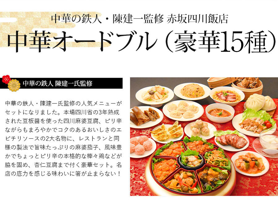 中華の鉄人 陳建一氏監修の人気メニューがさらにバリエーション豊富にオードブルセットになりました。本場四川省の3年熟成された豆板醤を使った四川麻婆豆腐、ピリ辛ながらもまろやかでコクのあるおいしさのエビチリソースの2大名物に、レストランと同様の製法で旨味たっぷりの麻婆茄子、風味豊かでちょっとピリ辛の本格的な棒々鶏などが脇を固め、杏仁豆腐まで付く豪華フルセット。大人気の手包み肉まんや直火炒め炒飯も加わって、存分に本格中華を楽しめるようになりました。名店の底力を感じる味わいに箸が止まりません。皆で集まるシーンに大活躍間違いナシです。