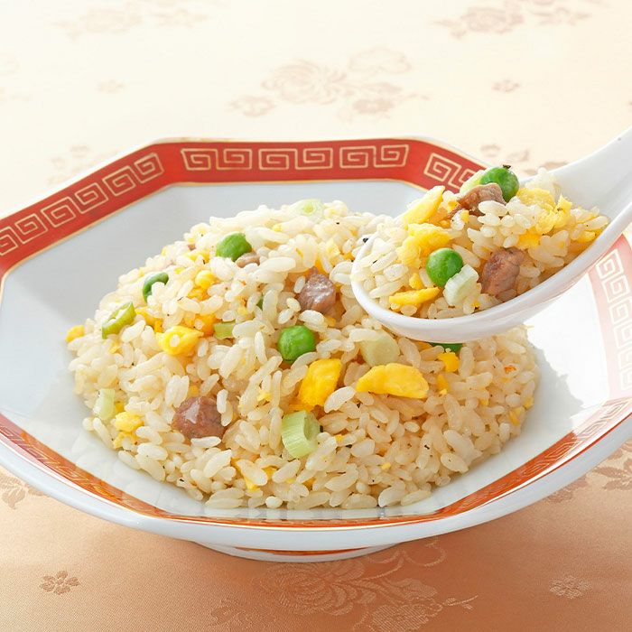 赤坂四川飯店のオリジナルレシピで作られた九州産黒豚入り直火炒め炒飯。陳建一オリジナルスープ「美味湯」でコクのある味付けをし、ふっくらパラパラに、香ばしく炒め上げています。蒸し炊飯製法で、冷凍で温めた直後はもちろんのこと、冷めてもふっくらごはんを実現。