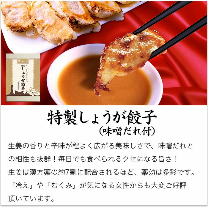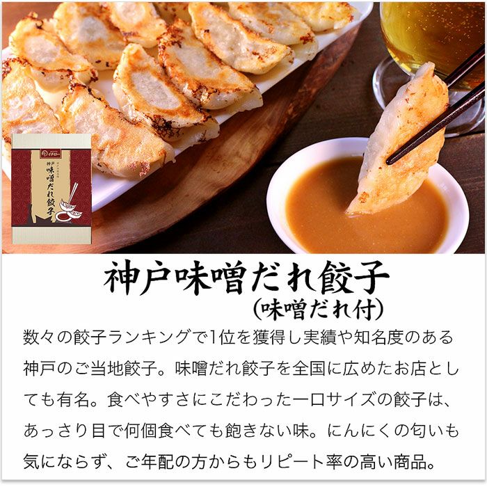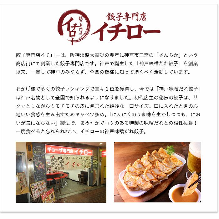 他の画像を見る 【餃子専門店イチロー】3種食べ比べ(味噌だれ20個、特製しょうが20個、神戸プレミアム味噌だれ14個) 味噌だれとの相性バツグンの3種類の餃子を手軽に食べ比べ 【餃子専門店イチロー】3種食べ比べ(味噌だれ20個、特製しょうが20個、神戸プレミアム味噌だれ14個) 販売価格 ¥ 4,280 税込 【味噌だれ餃子】サクッとしながらもモチモチが特徴の皮。キャベツのザクザク感と豚肉の旨味と甘みを引き出したあっさり仕立ての餃子は、かつおダシをベースに作られた特製の味噌だれと餃子の相性抜群。ニンニクの臭いを消しているので翌日も安心。ひと口頬張ると、キャベツの甘味と国産豚肉の深い旨みが溢れ出します。 【特製しょうが餃子】生姜の香りと辛味が程よく広がる美味しさで、味噌だれとの相性も抜群!クセになる旨さ!生姜は漢方薬の約7割に配合されるほど、薬効は多彩です。 【神戸ポークプレミアム味噌だれ餃子】神戸が誇るブランド豚「神戸ポークプレミアム」を100%使用したワンランク上の「神戸味噌だれ餃子」。たっぷりの旨味、脂身の甘み、肉の柔らかさ、そのどれもがプレミアムな逸品。まさにワンランク上の餃子です。 詳細を見る お気に入りに登録する