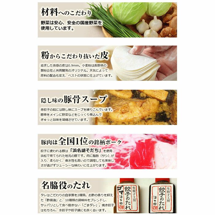 他の画像を見る 【浜太郎】浜松餃子 赤白セット(赤餃子20個・白餃子20個) にんにく入りの赤餃子、にんにく不使用の白餃子の2種セット 【浜太郎】浜松餃子 赤白セット(赤餃子20個・白餃子20個) 販売価格 ¥ 3,680 税込 浜太郎定番の赤餃子・白餃子のセットです。 【赤餃子】青森県産にんにく入り、ブランド豚「浜名湖そだち」をたっぷり使用し、ちょっと辛みを効かせたスタミナ系の餃子です。 【白餃子】ニンニクを使用しないで、天然コラーゲンをたっぷり混ぜ込んだ美容と健康のバランスが取れたヘルシーな餃子です。野菜は全て国産野菜を使用しております。 詳細を見る お気に入りに登録する