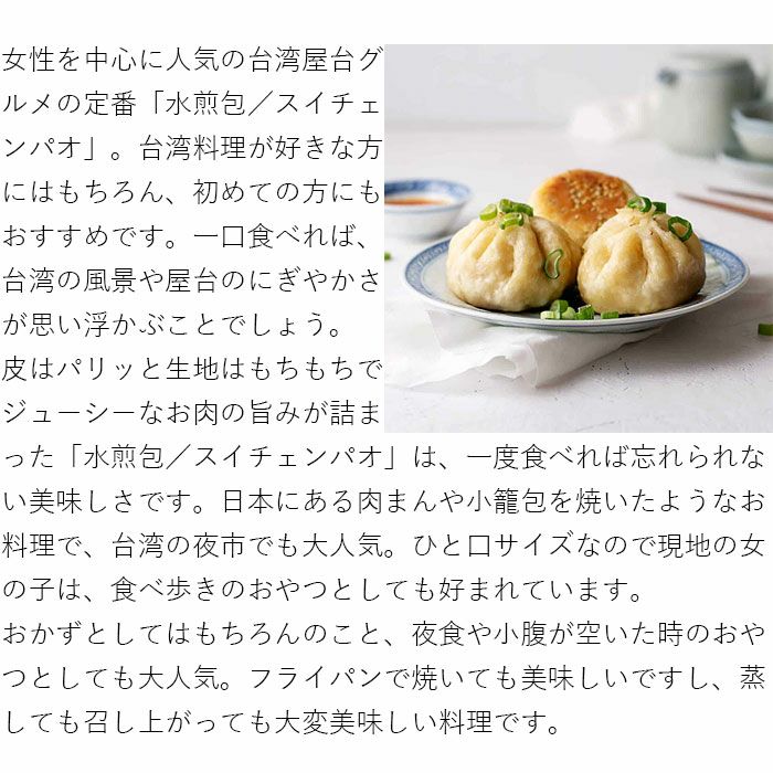 他の画像を見る 水煎包(スイチェンパオ) 肉汁とともに甘みがじわり広がる台湾屋台の定番グルメ 水煎包(スイチェンパオ) 販売価格 ¥ 3,180 税込 コロンと可愛く、小ぶりの肉まんのよう。こちらは神戸三宮から届く、台湾屋台の定番グルメだ。もっちりとした生地の皮に、頬張ればジューシーな肉の旨みと野菜の甘みが広がる。焼いてよし、ふっくら蒸してもよし、また冷めてもしっとり美味。おやつにピッタリ 詳細を見る お気に入りに登録する