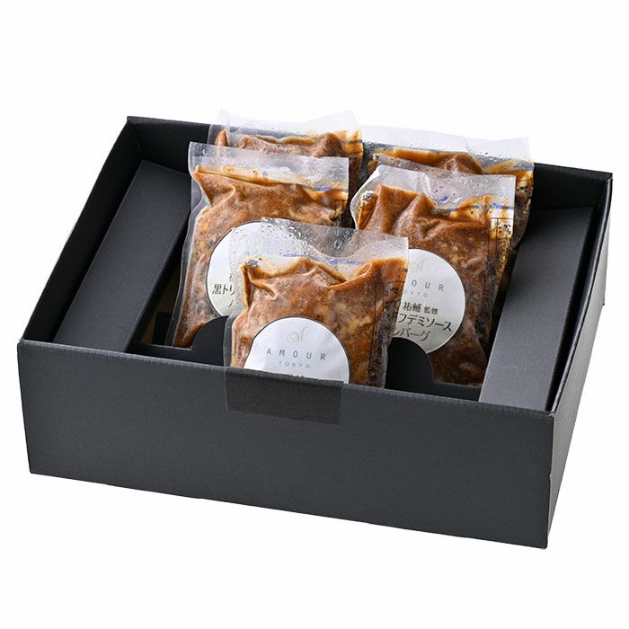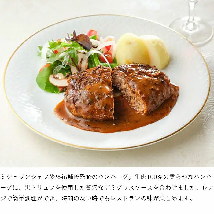 他の画像を見る フランス料理店アムール 後藤シェフ監修 黒トリュフデミソースハンバーグ 6個セット フレンチ巨匠監修、黒トリュフと牛肉100%の濃厚ハンバーグ フランス料理店アムール 後藤シェフ監修 黒トリュフデミソースハンバーグ 6個セット 販売価格 ¥ 5,560 税込 フレンチレストラン「AMOUR(アムール)」のエグゼクティブシェフを務める、ミシュランシェフ後藤祐輔氏監修のハンバーグセット。牛肉100%の柔らかなハンバーグに、黒トリュフを使用した贅沢なデミグラスソースを合わせました。レンジで簡単調理ができ、時間のない時でも本格的なフレンチレストランの味が楽しめます。某有名グルメガイドブックでは2013年にて一つ星を獲得し、以後、7年連続で一つ星を獲得したフレンチレストランの実績が感じられる逸品。 詳細を見る お気に入りに登録する