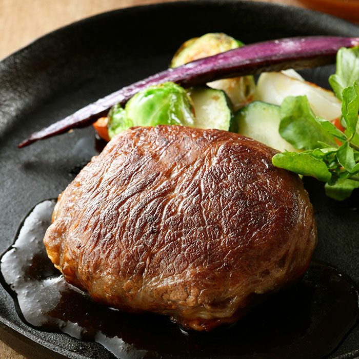 北海道牛を使い、玉ねぎ、卵、牛乳に至るまで北海道産にこだわったハンバーグ。オリジナルスパイスとともに牛肉の旨みをギュッと閉じ込め、そこにさらに北海道産霜降り牛肩ロースを巻くという贅沢さだ。むっちりとした肉感ながらくどさはなく、おろしソースで軽やかに楽しめる。