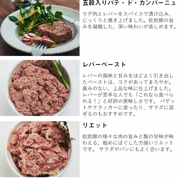 他の画像を見る 佐助豚シャルキュトリーセット 岩手ブランド豚のとろける旨味がギュッと凝縮 佐助豚シャルキュトリーセット 販売価格 ¥ 4,180 税込 融点の低い甘い脂が特長の佐助豚。その持ち味を生かしながら岩手の素材とともに仕上げたシャルキュトリー 3品。ウデ肉とレバーの旨みにスパイスを効かせた田舎風パテ、まろやかなレバーペースト。粗めにほぐした力強い風味のリエットはサンドイッチにも相性抜群だ。 詳細を見る お気に入りに登録する