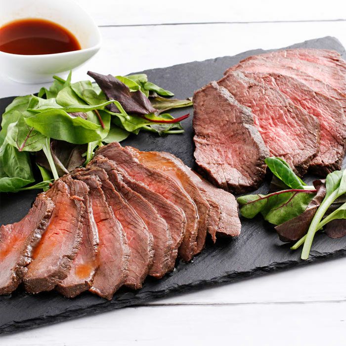 北海道産牛もも肉を使用したローストビーフ。真空調理で肉の中心まで通熱させながらも、しっとりジューシーで柔らか食感に仕上げた牛肉の美味しさが楽しめます。半解凍の状態で薄くカットするのがおすすめです。