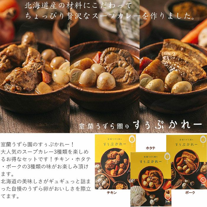 他の画像を見る 室蘭うずら園のすぅぷかれー3種セット 北海道産の材料にこだわって作ったちょっと贅沢なスープカレー 室蘭うずら園のすぅぷかれー3種セット 販売価格 ¥ 4,700 税込 道内唯一の無投薬飼育のうずら農家が作るスープカレーは、豪快な骨付きチキン、スパイス際立つポーク、濃厚なホタテの3種。いずれも舌にやさしくコクがあり、ゴロゴロ入るうずらの卵をくずして食べれば深みが増して、実に滋味深い。北海道の美味がギュッと詰まった元気の出る味だ。 詳細を見る お気に入りに登録する