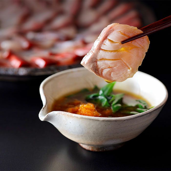 他の画像を見る 【下鴨茶寮】金目鯛の出汁しゃぶ(2~3人前) 金目鯛の旨みがとろける、贅沢な出汁しゃぶ 【下鴨茶寮】金目鯛の出汁しゃぶ(2~3人前) 販売価格 ¥ 16,700 税込 脂がのった国産の金目鯛を出汁にくぐらせれば、とろけるような甘みに。そこに、風味豊かなあおさが絡む口福。仕上げに葱油を添えて、柚子香るぽん酢で爽やかにいただけます。香りと旨みが重なる贅沢出汁しゃぶをお愉しみください。 詳細を見る お気に入りに登録する