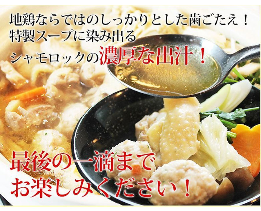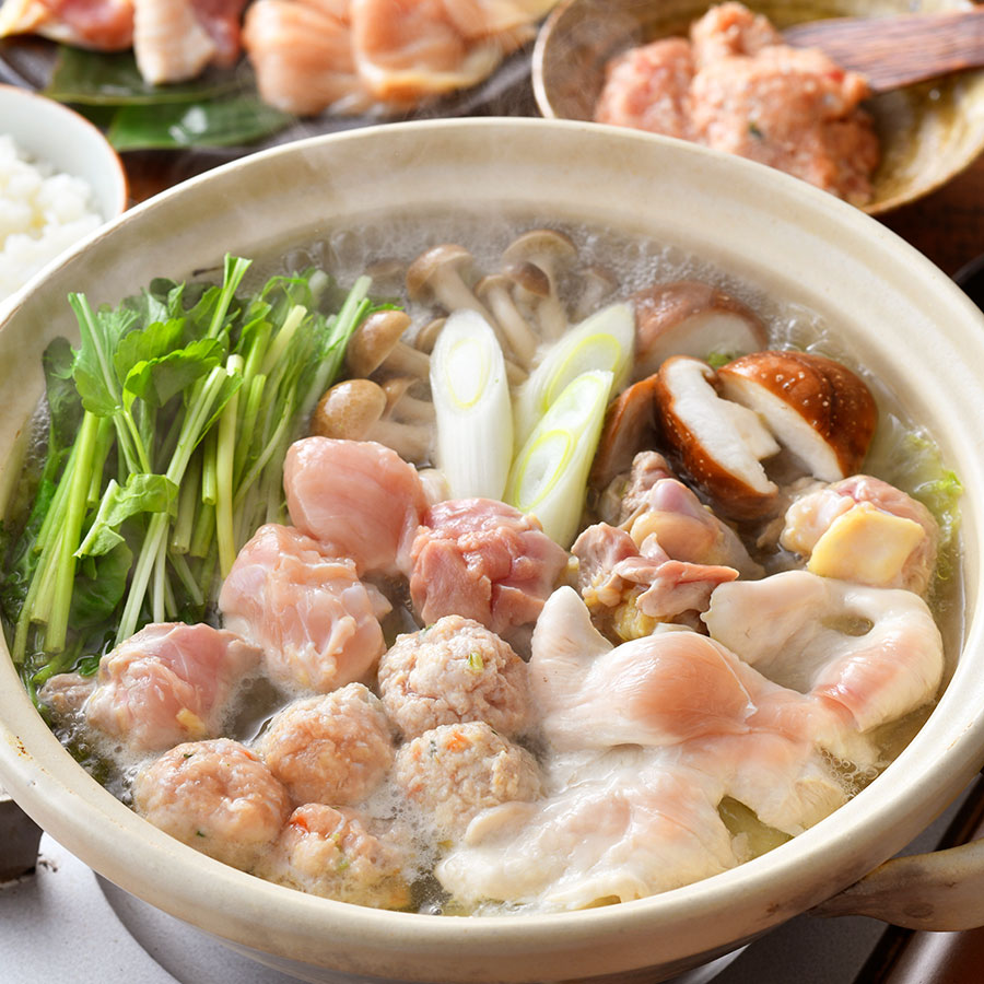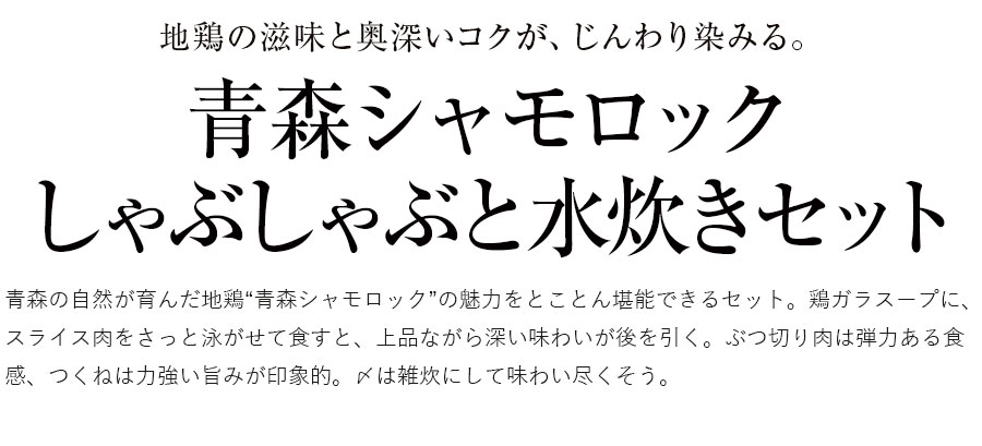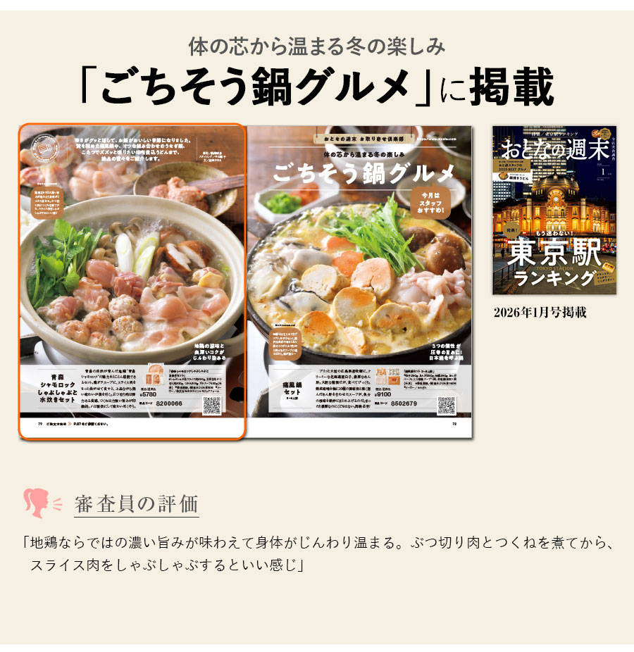 青森の自然が育んだ地鶏『青森シャモロック』の魅力をとことん堪能できるセット。鶏ガラスープに、スライス肉をさっと泳がせて食すと、上品ながら深い味わいが後を引く。ぶつ切り肉は弾力ある食感、つくねは力強い旨みが印象的。〆は雑炊にして味わい尽くそう。