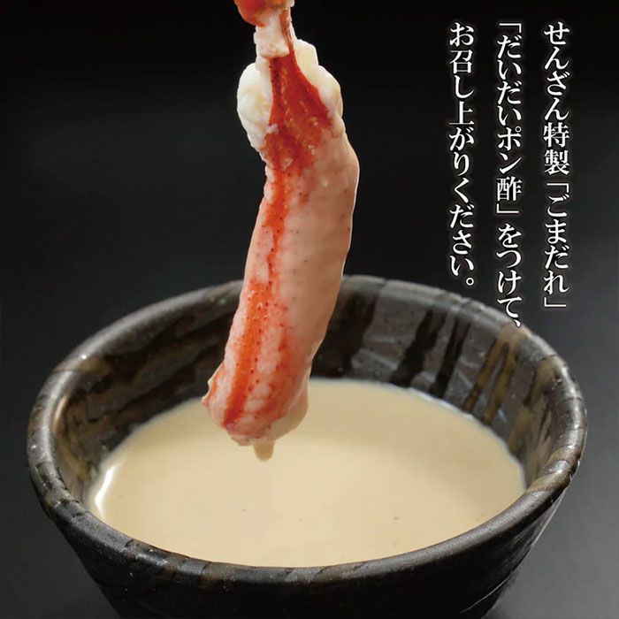 他の画像を見る せんざん かにしゃぶ鍋セット(3~4人前) 鮮度と味わいの頂点、バルダイ種の極上のカニしゃぶセット せんざん かにしゃぶ鍋セット(3~4人前) 販売価格 ¥ 13,500 税込 市場ではあまり出回らない、ずわい蟹の「バルダイ種」を使用。一般的なずわい蟹よりも脚が大きく肉厚で食べ応えがあり、味が濃いのが特徴です。また、自家製の濃厚なごまだれ、柑橘の橙が爽やかに香るだいだいポン酢、〆のうどんまでもセットになっているので、ご自宅で準備するのは鍋野菜のみで簡単にお楽しみいただけます。漁港の買参権を持つ「せんざん」のスタッフ自ら朝獲れの魚を漁港へ買い付けにいきネタを厳選しています。また、そのネタを液体急速凍結機「凍眠」で一般的な冷凍の約20倍の速さで冷凍する事で食材の細胞が壊れにくく、冷凍前の品質に近い状態でお届けする事ができます。かにしゃぶセットに入っているずわい蟹はお刺身でもお楽しみいただける程新鮮です。 詳細を見る お気に入りに登録する