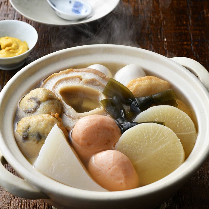 佐渡産の焼きあごダシと越後の地酒で煮切りしたツユは、やさしく清らかな味わい。老舗蒲鉾屋のおでんだけにタネもまたいい。新潟県産の南蛮エビを使ったしんじょうの風味に驚き、味の染みた車麩に唸る。大根や昆布なども入り、具材の旨みが重なってしみじみ美味。