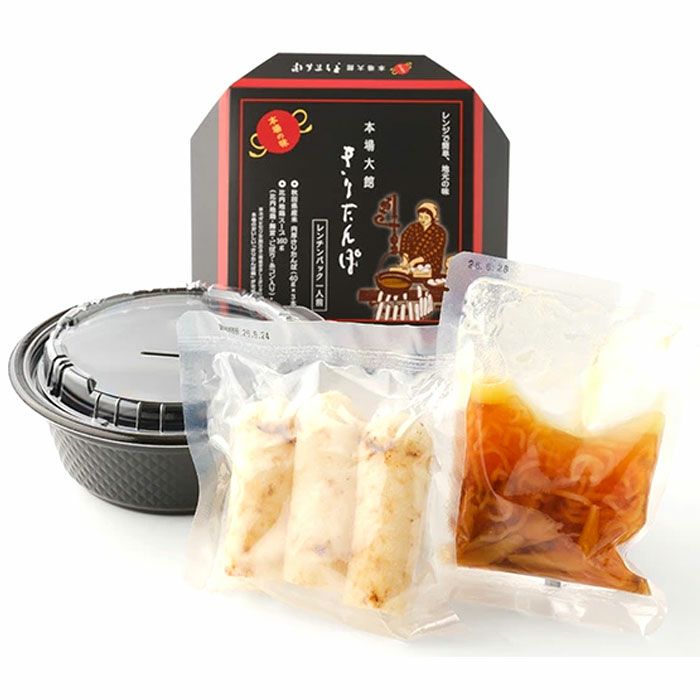 他の画像を見る 本場大館きりたんぽ レンチンパック1人前(2個セット) レンジで簡単本格派!比内地鶏きりたんぽ 本場大館きりたんぽ レンチンパック1人前(2個セット) 販売価格 ¥ 4,290 税込 販売期間 2025/11/11 0:00 〜 2026/03/31 23:59 きりたんぽ鍋の本場の味を全国の皆様に気軽に味わっていただきたいとの思いで開発した新商品です。賞味期限は常温で1年ですので、ご家庭で召し上がることはもちろん、高級感のあるデザインによりお土産やご贈答にも最適な商品です。商品の特徴として、比内地鶏のガラを100%使用した弊社人気のきりたんぽ専用だし「郷味」をベースに、比内地鶏肉、舞茸、ごぼう、糸こんを入れたスープと、秋田県産米から作った香ばしい肉厚きりたんぽをセットにしました。また、手に持って召し上がることを想定し、レンジで加熱しても熱くならない器の素材を厳選するなど、細部にまでこだわった逸品です。 詳細を見る お気に入りに登録する
