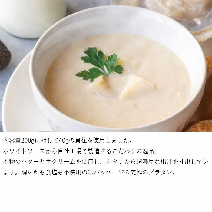 他の画像を見る ホタテチャウダー(4個セット)冷凍 ホタテの旨味とトリュフの香りを融合させたスープ ホタテチャウダー(4個セット)冷凍 販売価格 ¥ 5,200 税込 ホタテを余すことなく使用し、ホタテから超濃厚な出汁を取り出し、自社の手作りクリームソースにほたて貝柱とトリュフを入れ、ホタテの旨味とトリュフの香りを融合させたスープです。三陸の豊かな海で育った、肉厚な身が自慢の宮城県産ホタテ。そのホタテを、余すところなく使った濃厚な旨みが自慢の、特製ホタテブイヨンと生クリームに牛乳、トリュフをたっぷり合わせた、本格的な逸品です。口に入れた瞬間、フワッとホタテとトリュフの香りが広がり、からだも気持ちも温まる、幸せで贅沢なひとときを宮城の海からご自宅へお届けします。 詳細を見る お気に入りに登録する
