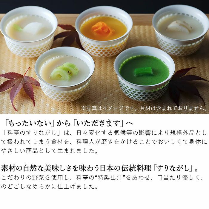 他の画像を見る 【下鴨茶寮】料亭のすりながし 老舗料亭「下鴨茶寮」が作る和のポタージュ 【下鴨茶寮】料亭のすりながし 販売価格 ¥ 4,600 税込 食材をすり潰してダシでのばした伝統料理「すりながし」。京の料亭の逸品は、野菜に特製ダシを合わせた、なめらかな舌触りが秀逸。温めていただくからどこまでもやさしく、野菜の自然な味わいとダシの香りが共鳴し合う。かぶらや山芋など5種のセット。 詳細を見る お気に入りに登録する