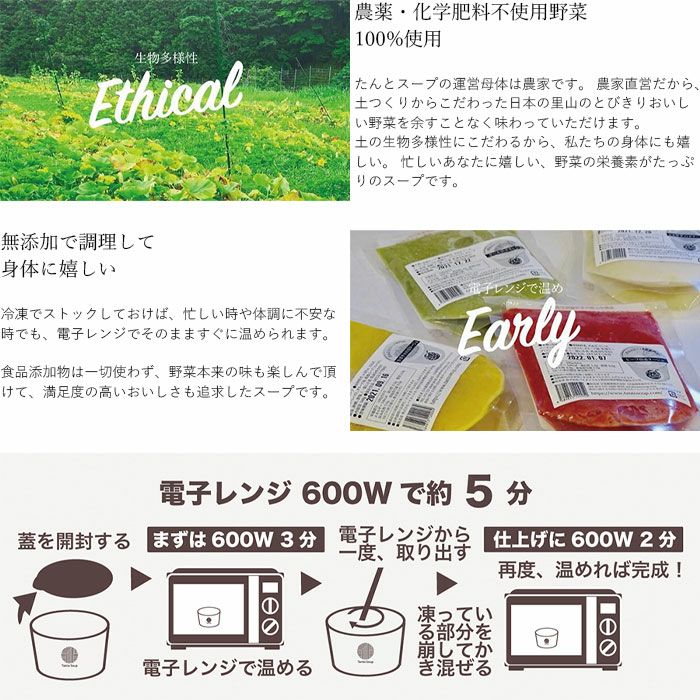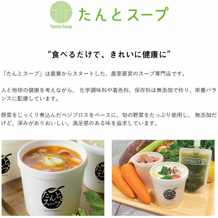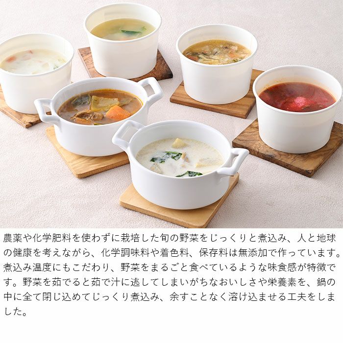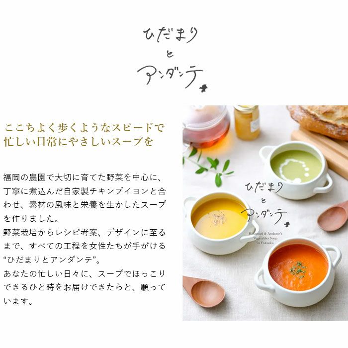 他の画像を見る たんとスープセット 野菜のおいしさがぎゅっと詰まったスープ たんとスープセット 販売価格 ¥ 4,850 税込 京都で土づくりからこだわり、農薬や化学肥料に頼らず育てた旬の野菜をた~んと使用。温度を見極めじっくり煮込み、野菜の旨みと素材感を生かしたスープに仕立てた。ビーツを主役にしたミネストローネ、玉ねぎの甘み際立つカレースープなど6種。どれも滋味深く、満足感たっぷり! 詳細を見る お気に入りに登録する