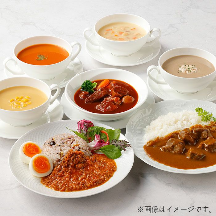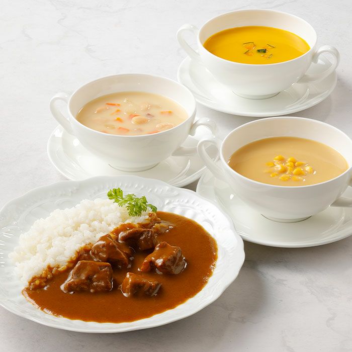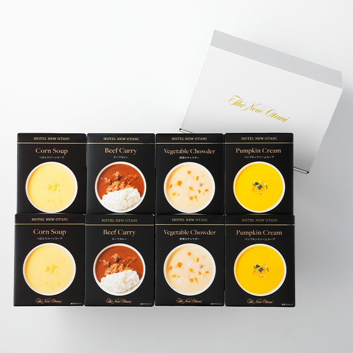 他の画像を見る ホテルニューオータニ レトルトスープ・惣菜セット(8個入) 本格派シェフの丹念仕込み、ホテルの味をご自宅で堪能 ホテルニューオータニ レトルトスープ・惣菜セット(8個入) 販売価格 ¥ 8,700 税込 ホテルニューオータニシェフ監修の、素材本来の味わいを活かした贅沢なスープセットです。つぶ入りコーンスープはとうもろこしを使用し、クリーミーでコーンの粒感を楽しめる仕上がり。マッシュルームとたまねぎ、長ねぎを合わせたクリームスープは、ワインの深みも感じられる上品な味わいです。オマール海老のビスクはオマールえびヘッドをベースにトマトやにんにくが効き、濃厚でコクのある味わいに仕上げました。ドライカレーは野菜と牛・豚肉をたっぷり使い、トマトピューレーやワインでコクを出し、スパイスの香りが食欲をそそります。ビーフカレーは牛肉を使用し、りんごピューレーやトマトケチャップでまろやかさを加え、香辛料とウスターソースが絶妙に調和。ビーフシチューは牛肉とブイヨン、ワインを使い、マッシュルームやトマトペーストが味に深みを与えています。ハッシュドビーフはたまねぎとにんにくを効かせ、トマトケチャップとワインでコクと甘みを引き出したリッチな味わいです。ホテルシェフの洗練された技と丹念な仕込みによって生まれた、それぞれのスープが持つ個性豊かな味わいをぜひお楽しみください。 詳細を見る お気に入りに登録する