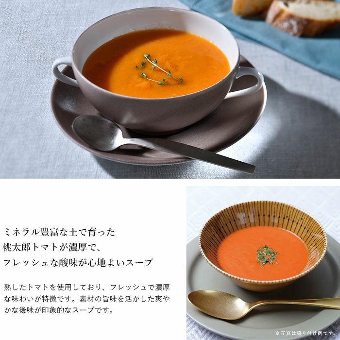 他の画像を見る 完熟トマトのスープ6食セット トマトが濃厚でフレッシュな酸味が心地よいスープ 完熟トマトのスープ6食セット 販売価格 ¥ 5,600 税込 福岡の地から届くのは、女性たちが手がける安心安全な素材とレシピによる野菜スープ。ミネラル豊富な土で育った桃太郎トマトを収穫当日に加工、自家製ブイヨンでのばして旨みと栄養を凝縮したフルーティな甘みの後にやわらかな酸味が広がり、滋味が沁み入るおいしさだ。 詳細を見る お気に入りに登録する