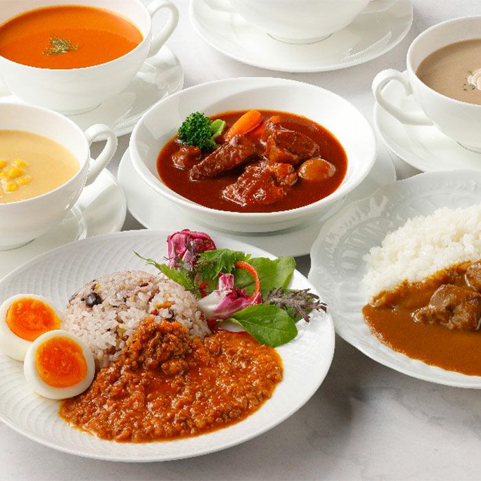 ホテルニューオータニシェフ監修の、素材本来の味わいを活かした贅沢なスープセットです。つぶ入りコーンスープはとうもろこしを使用し、クリーミーでコーンの粒感を楽しめる仕上がり。マッシュルームとたまねぎ、長ねぎを合わせたクリームスープは、ワインの深みも感じられる上品な味わいです。オマール海老のビスクはオマールえびヘッドをベースにトマトやにんにくが効き、濃厚でコクのある味わいに仕上げました。ドライカレーは野菜と牛・豚肉をたっぷり使い、トマトピューレーやワインでコクを出し、スパイスの香りが食欲をそそります。ビーフカレーは牛肉を使用し、りんごピューレーやトマトケチャップでまろやかさを加え、香辛料とウスターソースが絶妙に調和。ビーフシチューは牛肉とブイヨン、ワインを使い、マッシュルームやトマトペーストが味に深みを与えています。ハッシュドビーフはたまねぎとにんにくを効かせ、トマトケチャップとワインでコクと甘みを引き出したリッチな味わいです。ホテルシェフの洗練された技と丹念な仕込みによって生まれた、それぞれのスープが持つ個性豊かな味わいをぜひお楽しみください。