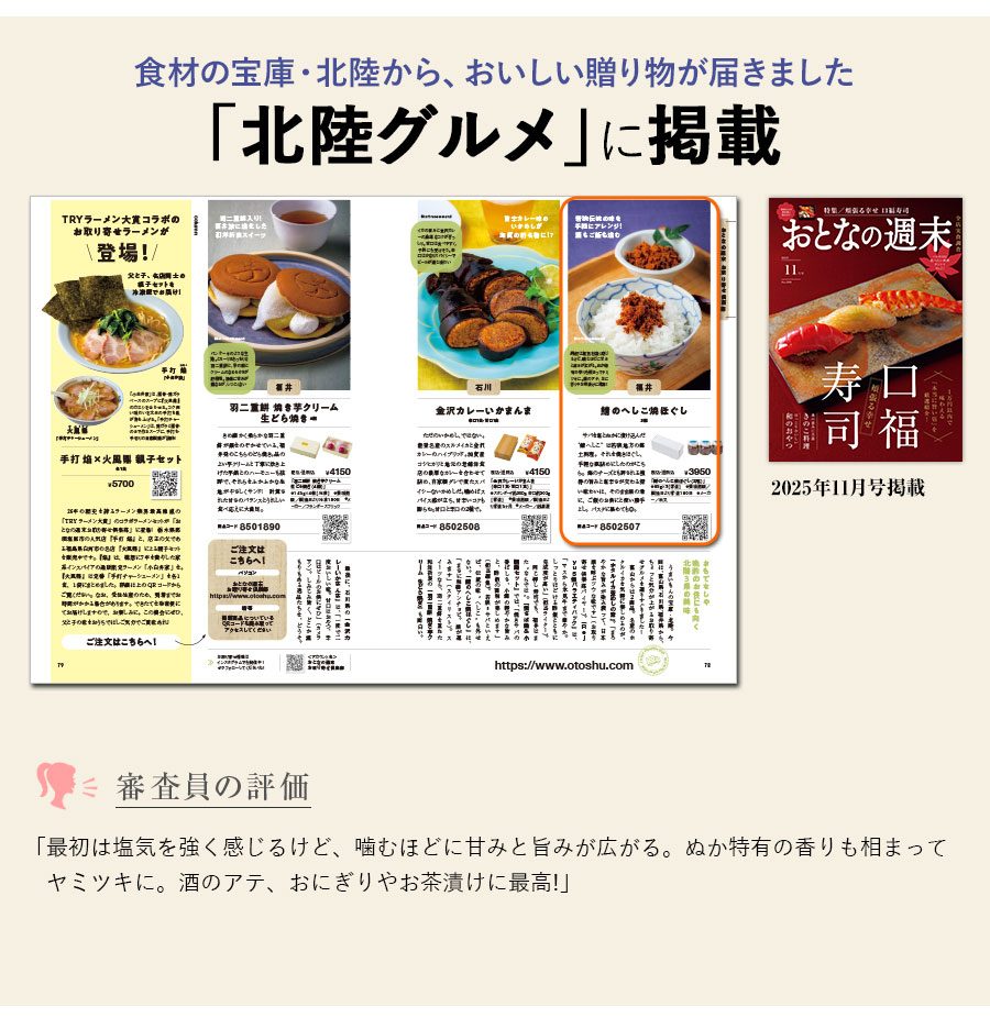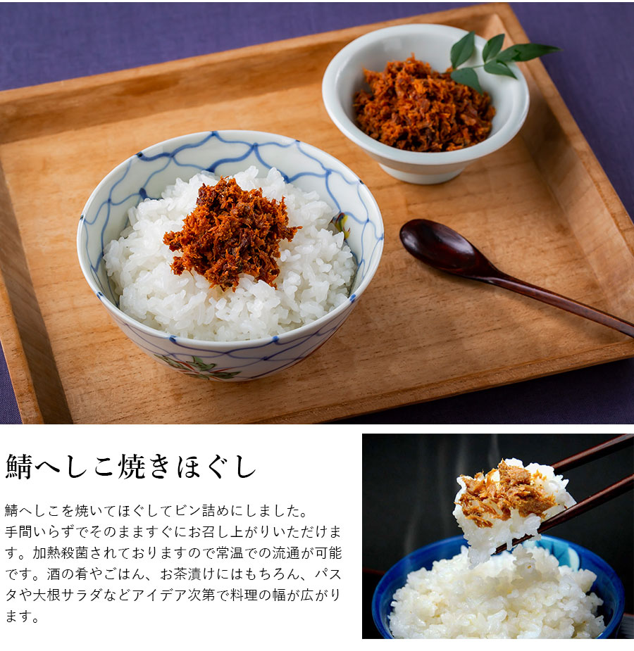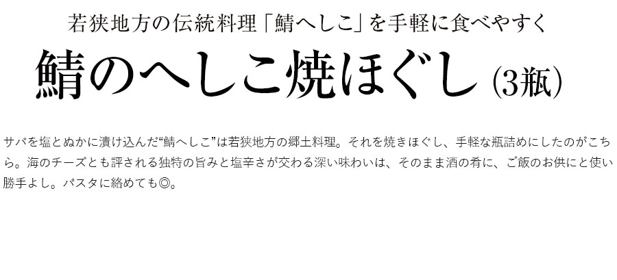 サバを塩とぬかに漬け込んだ『鯖へしこ』は若狭地方の郷土料理。それを焼きほぐし、手軽な瓶詰めにしたのがこちら。海のチーズとも評される独特の旨みと塩辛さが交わる深い味わいは、そのまま酒の肴に、ご飯のお供にと使い勝手よし。パスタに絡めても◎。
