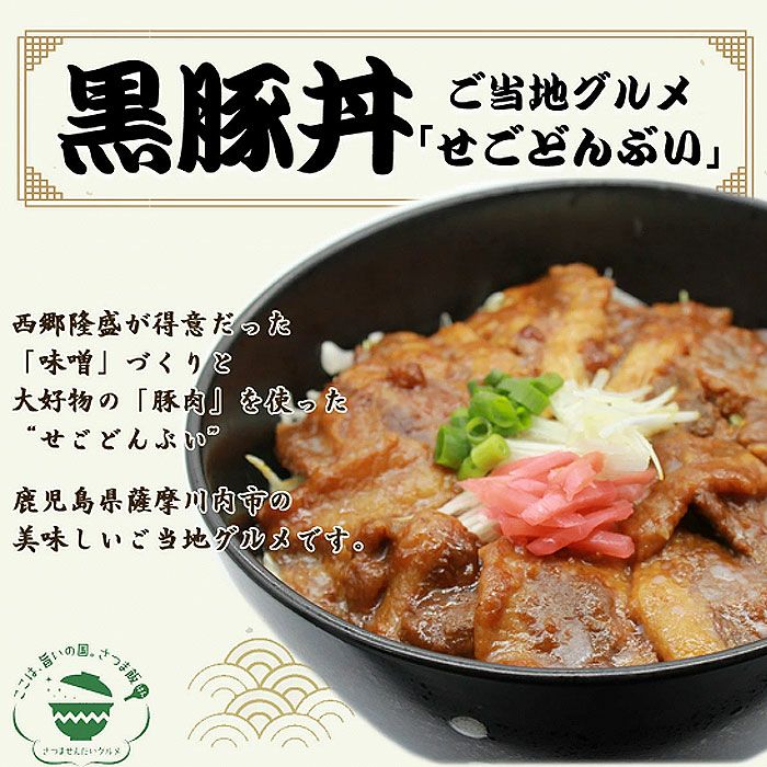 他の画像を見る せごどんぶい 黒豚丼×4箱 「せごどん」も唸る!黒豚と麦みその薩摩丼ぶり せごどんぶい 黒豚丼×4箱 販売価格 ¥ 4,450 税込 鹿児島県産の黒豚と麦みそを使用し、薩摩川内市で製造しました。隠し味に生姜をきかせ、さっぱりとした黒豚丼に仕上げました。こだわりの黒豚丼をご堪能いただけます。薩摩川内市ご当地グルメ「せごどんぶい」とは、豚肉が大好きで、味噌作りが得意だった西郷隆盛(せごどん)に食べてほしい、そんな想いで生まれたのが「せごどんぶい」です。薩摩川内市では、様々な「せごどんぶい」を食べることができます。 詳細を見る お気に入りに登録する