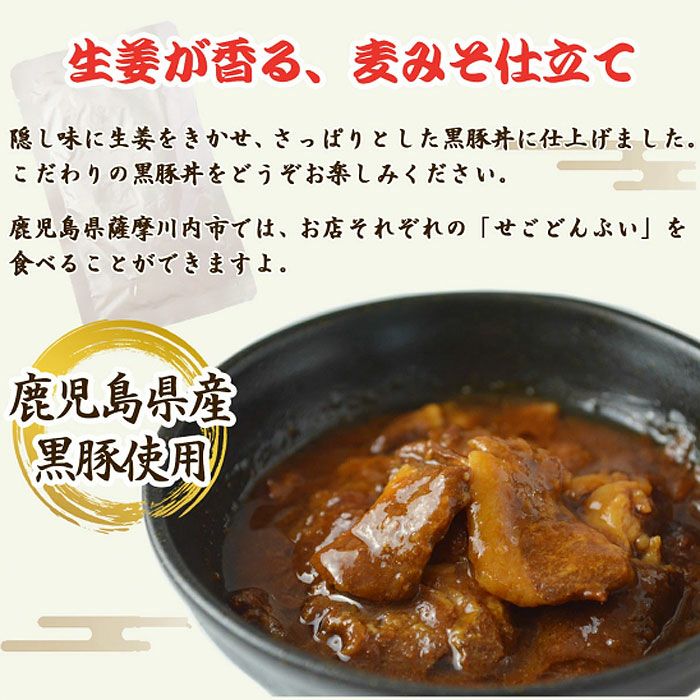 他の画像を見る せごどんぶい 黒豚丼×4箱 「せごどん」も唸る!黒豚と麦みその薩摩丼ぶり せごどんぶい 黒豚丼×4箱 販売価格 ¥ 4,150 税込 鹿児島県産の黒豚と麦みそを使用し、薩摩川内市で製造しました。隠し味に生姜をきかせ、さっぱりとした黒豚丼に仕上げました。こだわりの黒豚丼をご堪能いただけます。薩摩川内市ご当地グルメ「せごどんぶい」とは、豚肉が大好きで、味噌作りが得意だった西郷隆盛(せごどん)に食べてほしい、そんな想いで生まれたのが「せごどんぶい」です。薩摩川内市では、様々な「せごどんぶい」を食べることができます。 詳細を見る お気に入りに登録する