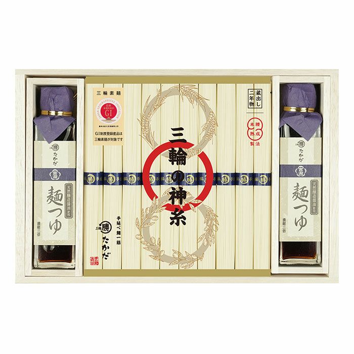他の画像を見る 三輪の神糸(蔵出し二年物)つゆ詰合せ 【販売期間限定商品:4月~8月頃まで】 熟成された三輪素麺と特製つゆの期間限定セット 三輪の神糸(蔵出し二年物)つゆ詰合せ 【販売期間限定商品:4月~8月頃まで】 販売価格 ¥ 6,260 税込 販売を終了しました。 手延べ麺一筋、マル勝髙田商店こだわりの製法【本腰熟成製法】で丁寧に製麺された三輪素麺。2種のオリジナルブレンドの小麦粉、イタリアから直輸入したエキストラバージンオリーブオイル、強い粘りに欠かせない国産の塩を使用し伝承の手延べの技術で丹念に仕上げ、マル勝髙田自慢の素麺蔵で1年以上熟成させた三輪素麺です。 詳細を見る お気に入りに登録する