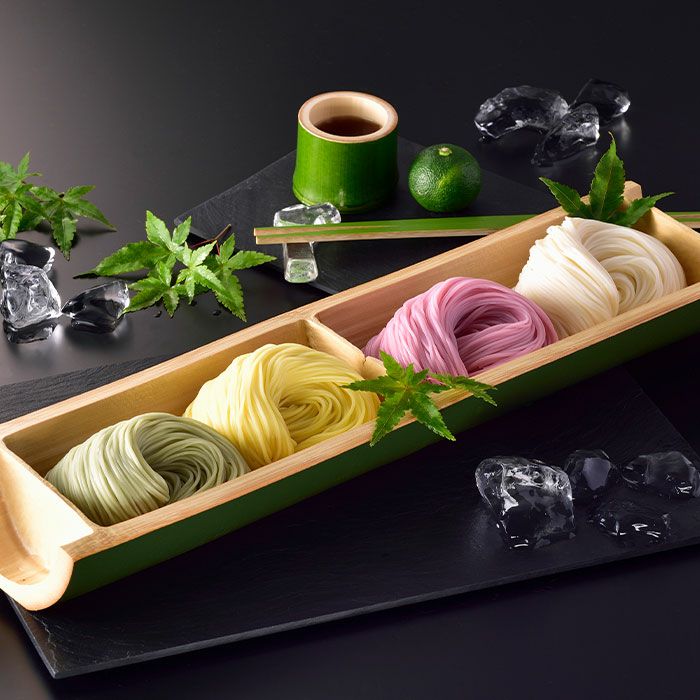 ○内容量:【白素麺】50g×10束、【抹茶素麺】50g×2束、【柚子素麺】50g×2束、【梅素麺】50g×2束 合計800g