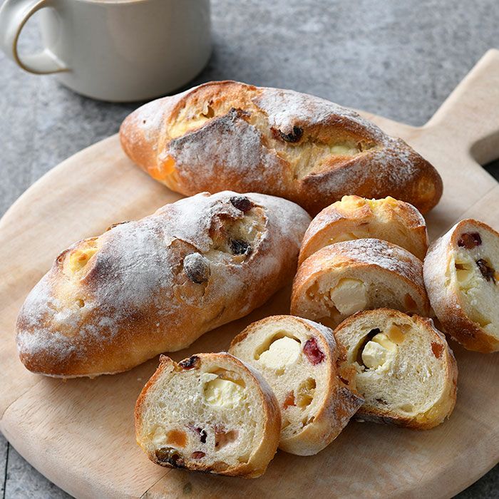 石川県小松市にある小さなパン屋の人気商品がこちら。長時間低温熟成させた深い味わいのフランスパン生地に、クランベリー、パパイヤ、パイナップル、レーズンがぎっしり。その甘酸っぱさと、これまたたっぷり詰まったクリームチーズのコクが絶妙にマッチして、おやつやワインのお供にも◎。