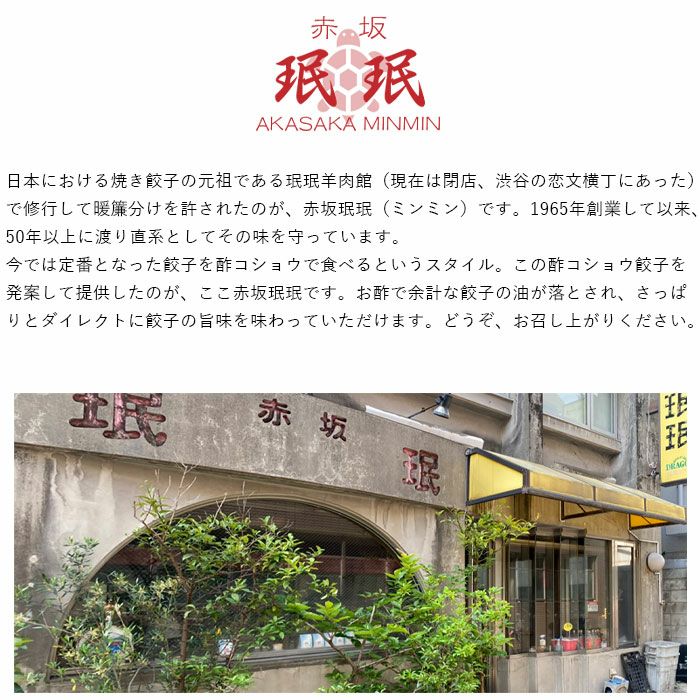 他の画像を見る 【赤坂珉珉】冷凍赤坂みんみん餃子(50個) 名店の餃子が薄皮で焼きやすいお取り寄せ仕様に 【赤坂珉珉】冷凍赤坂みんみん餃子(50個) 販売価格 ¥ 3,750 税込 酢コショウで食べるスタイルを生み出した、あの『赤坂珉珉』の焼餃子。粗切りの豚肉・白菜・にらなどが入る自慢の餡はそのままに、薄皮で食べやすいサイズになっている。かじれば肉汁じわり。濃厚な旨みがあり、酢コショウに付けるとやはりその旨さを一層堪能できる。 詳細を見る お気に入りに登録する