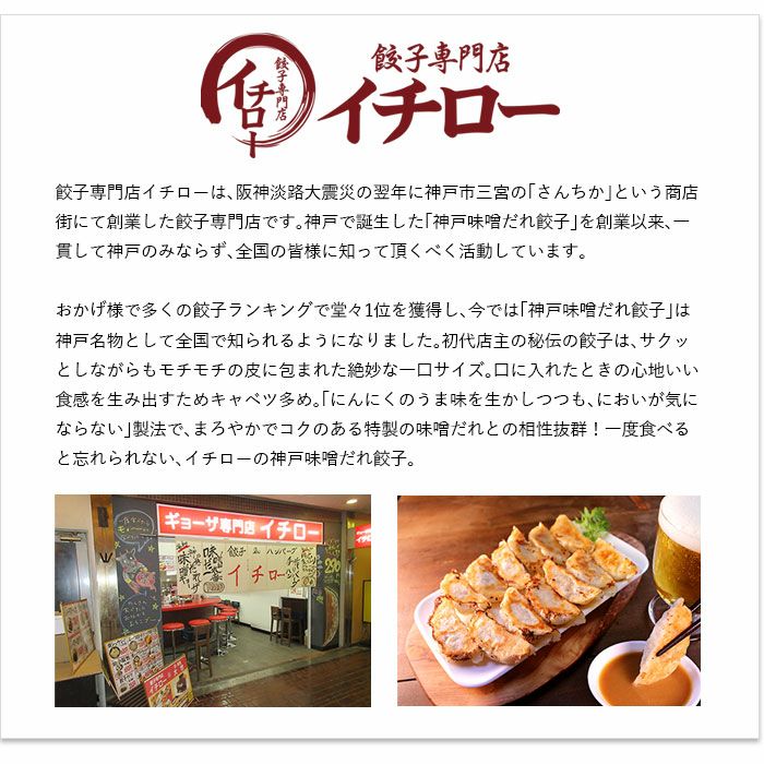他の画像を見る 【餃子専門店イチロー】3種食べ比べ(味噌だれ20個、特製しょうが20個、神戸プレミアム味噌だれ14個) 味噌だれとの相性バツグンの3種類の餃子を手軽に食べ比べ 【餃子専門店イチロー】3種食べ比べ(味噌だれ20個、特製しょうが20個、神戸プレミアム味噌だれ14個) 販売価格 ¥ 4,280 税込 【味噌だれ餃子】サクッとしながらもモチモチが特徴の皮。キャベツのザクザク感と豚肉の旨味と甘みを引き出したあっさり仕立ての餃子は、かつおダシをベースに作られた特製の味噌だれと餃子の相性抜群。ニンニクの臭いを消しているので翌日も安心。ひと口頬張ると、キャベツの甘味と国産豚肉の深い旨みが溢れ出します。 【特製しょうが餃子】生姜の香りと辛味が程よく広がる美味しさで、味噌だれとの相性も抜群!クセになる旨さ!生姜は漢方薬の約7割に配合されるほど、薬効は多彩です。 【神戸ポークプレミアム味噌だれ餃子】神戸が誇るブランド豚「神戸ポークプレミアム」を100%使用したワンランク上の「神戸味噌だれ餃子」。たっぷりの旨味、脂身の甘み、肉の柔らかさ、そのどれもがプレミアムな逸品。まさにワンランク上の餃子です。 詳細を見る お気に入りに登録する