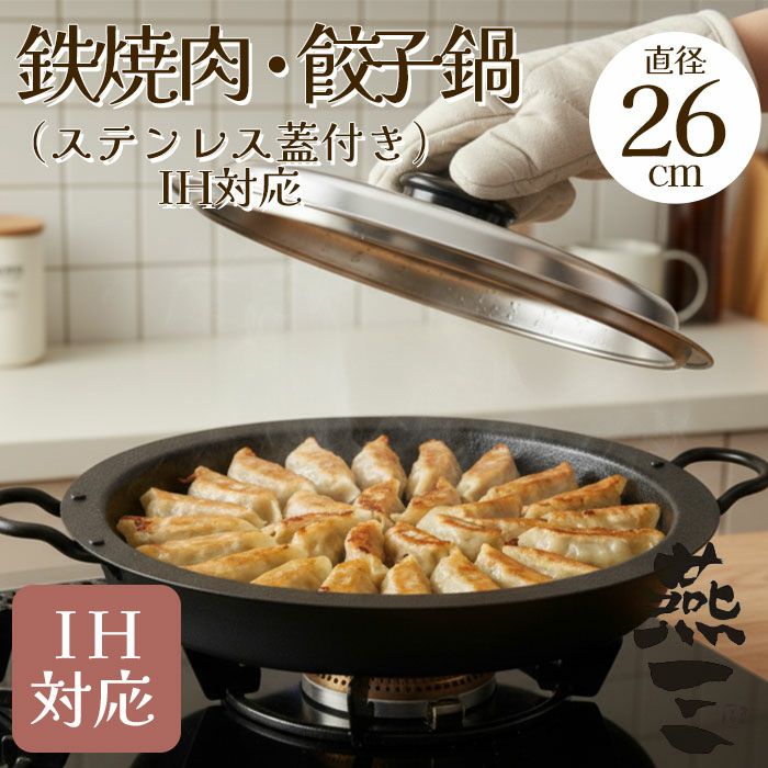他の画像を見る 鉄焼肉・餃子鍋26cm(ステンレス蓋付き)IH対応【燕三(えんぞう)】 憧れの羽根付き餃子を自宅で、プロ級の焼き上がり 鉄焼肉・餃子鍋26cm(ステンレス蓋付き)IH対応【燕三(えんぞう)】 販売価格 ¥ 6,550 税込 焼き物調理に優れた鉄を浅く平らな形状に仕立てることで、キッチンや卓上でも使いやすく、焼肉などの鉄板焼きや餃子、パエリアを楽しめます。表面は凹凸のあるファイバーライン加工なのでこびりつきを軽減します。IHクッキングヒーターにも使えます。 詳細を見る お気に入りに登録する