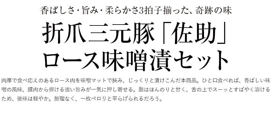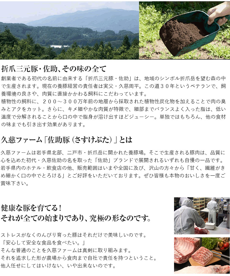 ○名称:佐助豚 ロース味噌漬け ○内容量:佐助豚ロース120g3枚×2、(味噌マット200g×2枚) ○原材料名:豚ロース肉(岩手県産)、味噌マット(米味噌、大豆、食塩、酒精(原材料の一部に大豆を含む) ○配送形態:冷凍(宅配BOX・置配不可) ○保存方法:冷凍 ○賞味期限:製造日より180日 ○熨斗:可 ○名入れ:可 ○包装:不可 ○備考 味噌マットでお肉を挟み漬け込んでおりますので、封を開けずに目安で8時間冷蔵庫で解凍してください。お肉を脂を薄く塗ったフライパンまたは、グリル網でじっくりと焼いてください。また炭火で焼くとより一層香ばしさや肉の旨みが引き出され、より味わい深くお召し上がり頂けます。 ○製造者:【久慈ファーム有限会社】岩手県二戸市下斗米字十文字50-12
