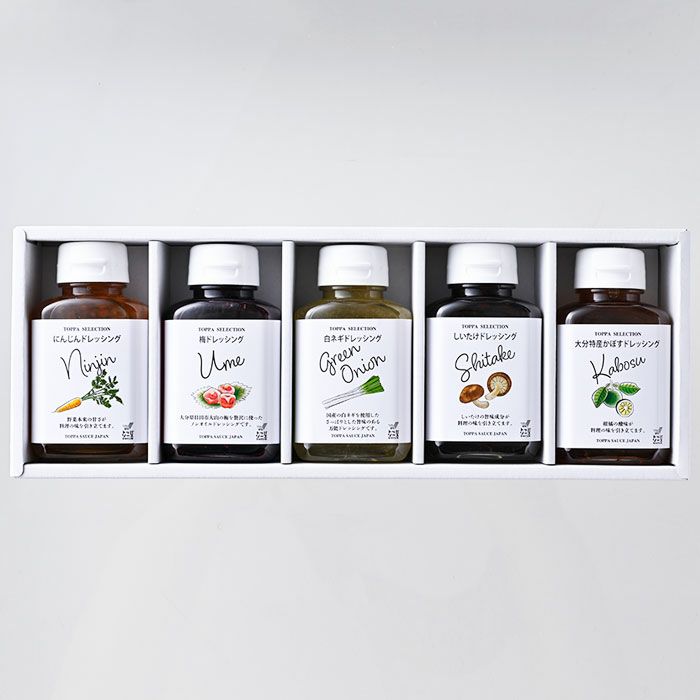 他の画像を見る 【TOPPA SELECTION(トッパセレクション)】ドレッシングギフトセット 大分県産の食材をふんだんに使用したドレッシング 【TOPPA SELECTION(トッパセレクション)】ドレッシングギフトセット 販売価格 ¥ 3,600 税込 大分県の素材の恵みが詰まったドレッシング。爽やかな酸味で冷奴にも合う「かぼす」、冷菜系料理にもバッチリ&万能な「白ネギ」、滋味あふれる旨みが料理の味を引き立てる「しいたけ」など5種。いずれも素材感と香りが楽しく、サラダの表 情をガラリと変えてくれる。 詳細を見る お気に入りに登録する
