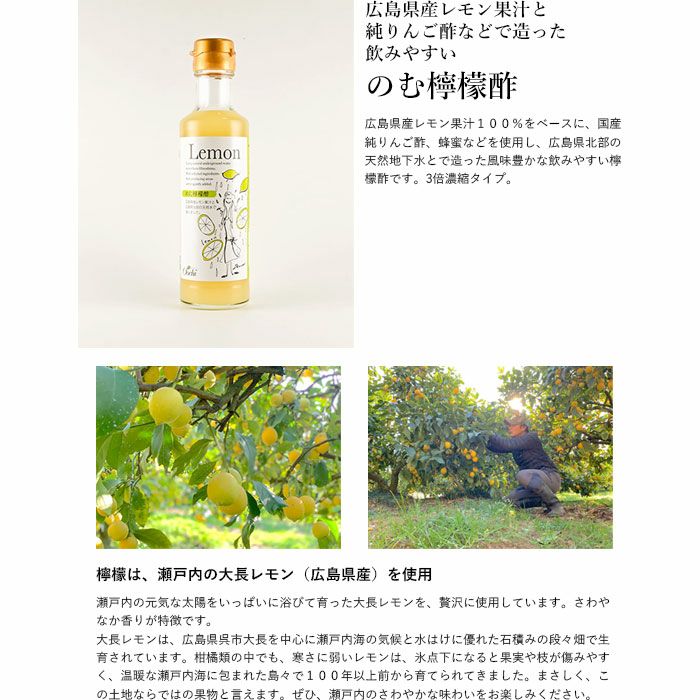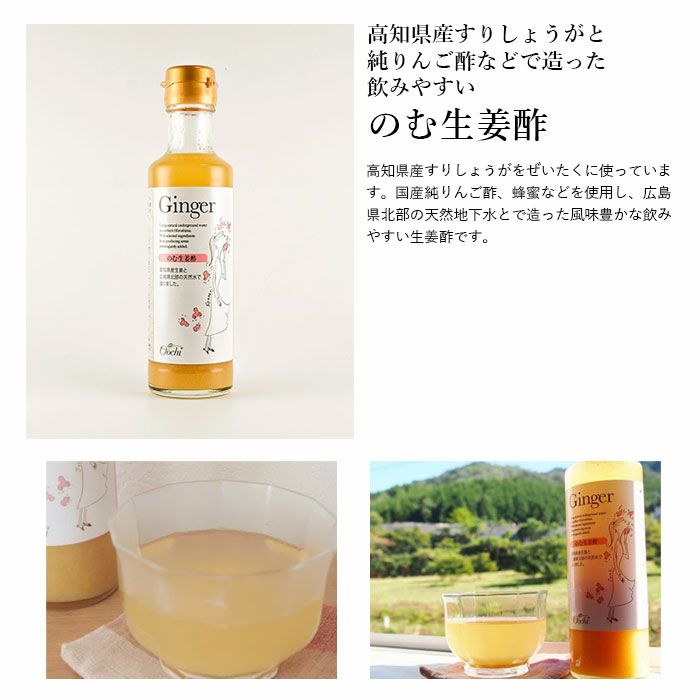 他の画像を見る のむ酢セット(柚子・生姜・檸檬) リンゴ酢やはちみつを使いぐっと飲みやすく のむ酢セット(柚子・生姜・檸檬) 販売価格 ¥ 5,300 税込 国産純りんご酢と広島の天然地下水をベースに、ハチミツなどを合わせて飲みやすく仕上げた飲むお酢。高知県産すり生姜、徳島県産柚子果汁、広島県産レモン果汁100%をそれぞれ加えた3種のフレーバーで、爽やかな香りと風味が特長だ。水や炭酸で割って楽しんで。 詳細を見る お気に入りに登録する