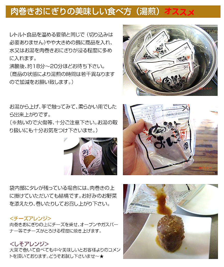 ○名称:肉巻きおにぎり ○内容量:120g×6個 ○原材料名:米、豚肉、米発酵調味料、料理酒、醤油、砂糖、ゴマ、醸造酢、植物油脂、食塩、水あめ、味噌、にんにく、しょうが/増粘剤(キタンサンガム)、乳化剤、調味料(アミノ酸等)、酸味料、カラメル色素(一部に小麦、大豆を含む) ○配送形態:冷凍(宅配BOX・置配不可) ○保存方法:冷凍 ○賞味期限:製造より180日 ○熨斗:不可 ○名入れ:不可 ○包装:不可 ○手提げ:不可 ○備考:レンジまたは湯煎 ○製造者:【本家 宮崎肉巻きおにぎり】〒880-0912 宮崎県宮崎市大字赤江字飛江田979番地1