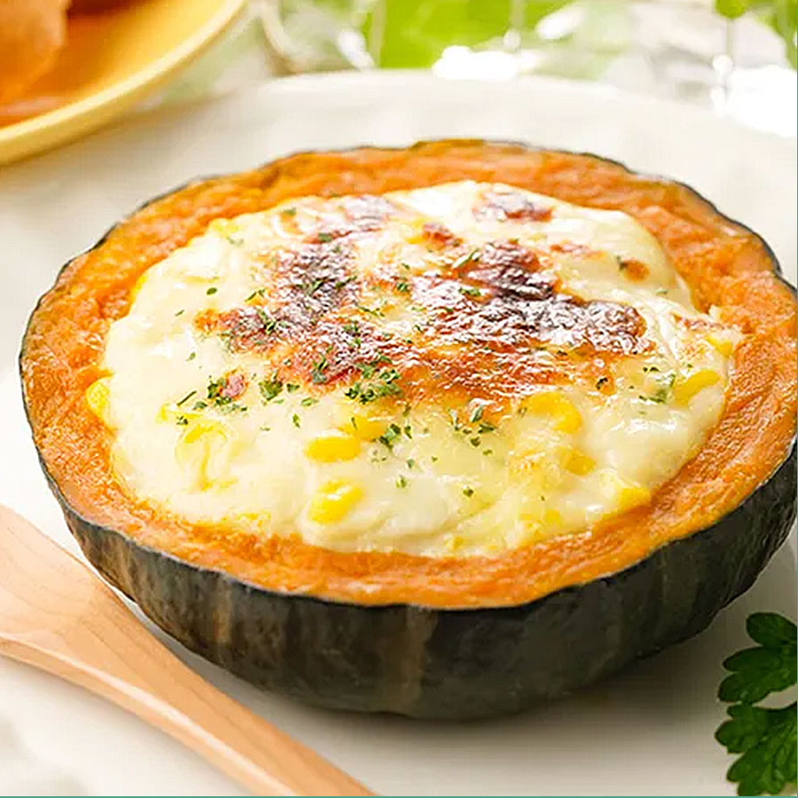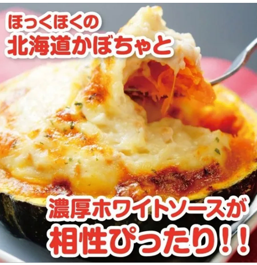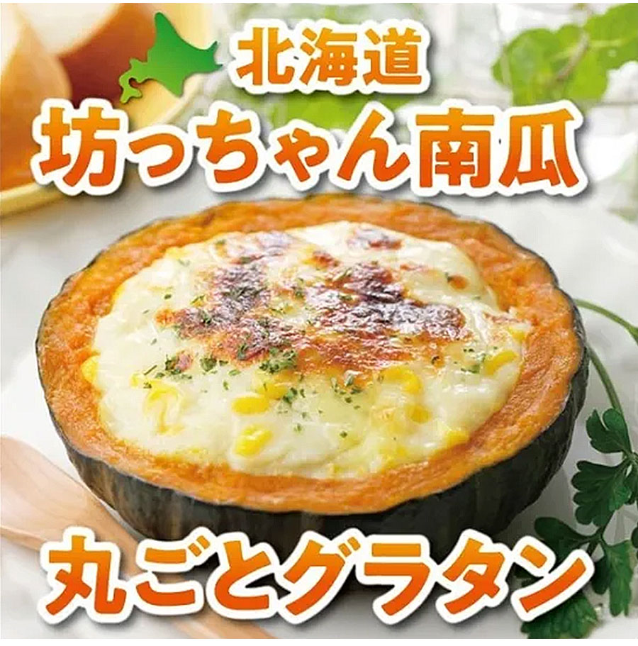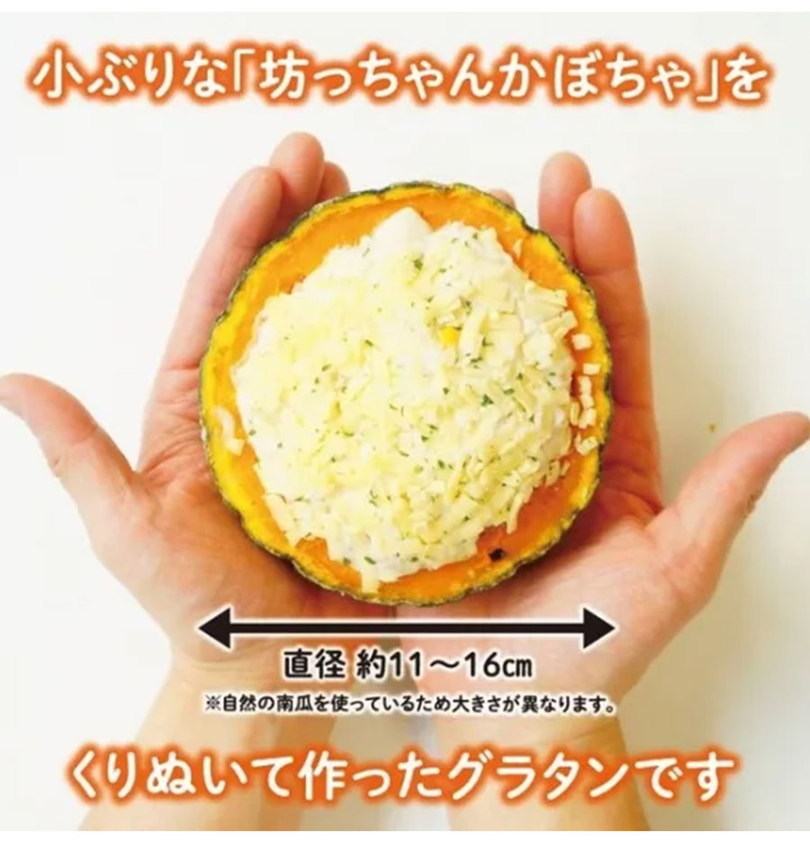 皮までおいしい北海道十勝産の「坊っちゃんかぼちゃ」をくりぬいて、北海道豊富町産の牛乳で作った濃厚なホワイトソースを詰めたグラタンです。レンジとトースターで温めるだけで簡単に豪華な食卓を演出できる一品です。ハロウインのパーティーの時にもぴったりのかぼちゃを使ったグラタンは、目で見ても、食べてみてもおいしいグラタンです。ホックホクの北海道南瓜の素材のよさを活かせるように濃厚なホワイトソース、とろとろのチーズをバランスよく盛り付けしています。電子レンジやオーブン調理だけで簡単に北海道の大地の恵みを堪能できます。