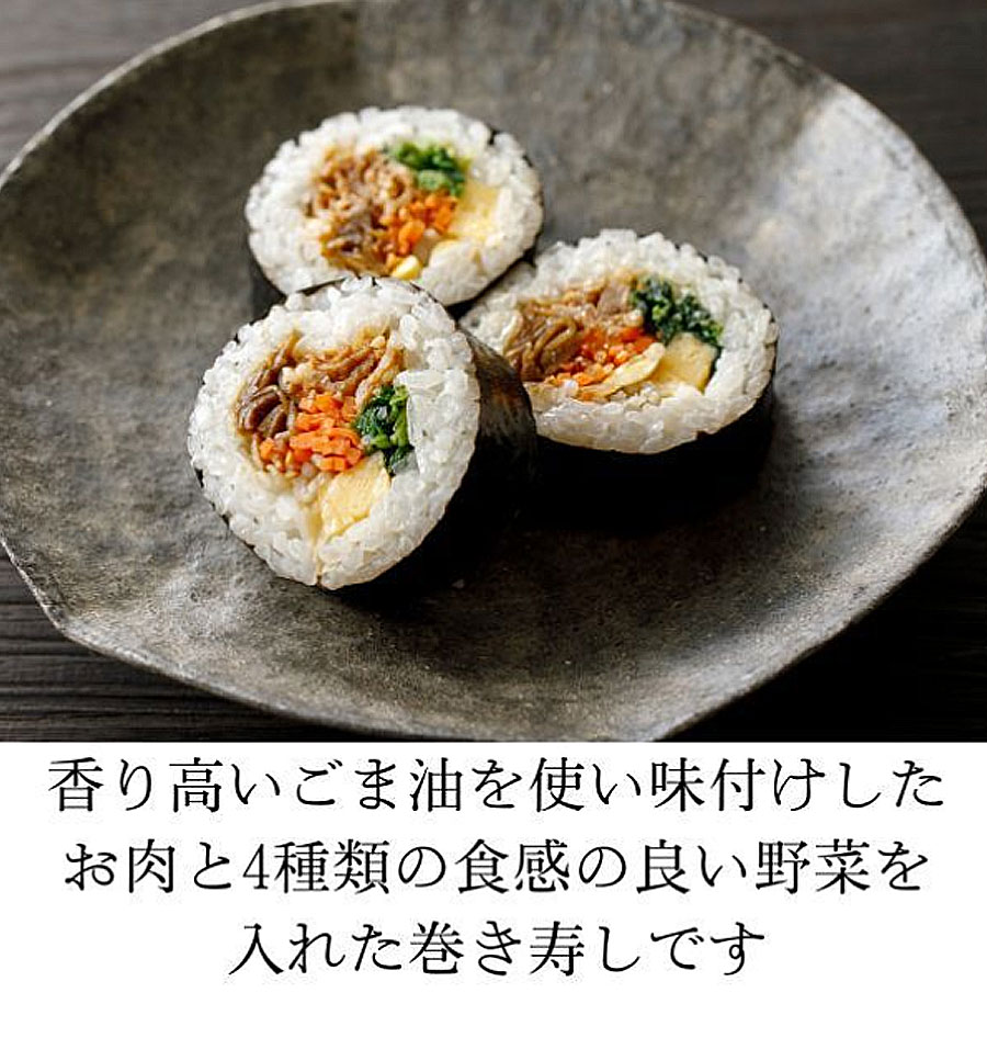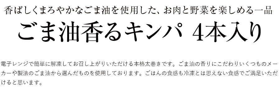 電子レンジで簡単に解凍してお召し上がりいただける本格太巻きです。ごま油の香りにこだわりいくつものメーカーや製法のごま油から選んだものを使用しております。ごはんの食感も冷凍とは思えない食感でご満足いただけると思います。