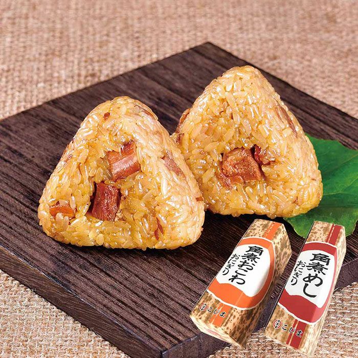 皮付三枚肉と呼ばれる豚ばら肉をしょうゆ・砂糖・酒・みりんなどのたれで煮込んだ甘めの味付けが特徴です。とろけるような脂身、たれの旨味を含んだ赤身肉が重なる絶妙なバランスの角煮は長崎を代表する料理として全国で注目を集めています。その角煮をきざみ、牛蒡・人参・椎茸を角煮タレと煮込み、炊立てご飯に混ぜ合せおにぎりにした「角煮めしおにぎり」と、角煮タレと共に炊立てもち米に混ぜ合せたおこわにした「角煮おこわおにぎり」のセットです。「角煮めしおにぎり」はうるち米8割にもち米2割を加えて食感がよくなるよう工夫し、角煮の旨味に野菜の旨味が加わってよりおいしさを追及しました。「角煮おこわおにぎり」はモチモチとした食感の中から染み込んだ角煮たれの旨味がにじみ出て、よりおいしく食べれるように国内で最も粘りが強いとされるヒヨクモチを使用しております。