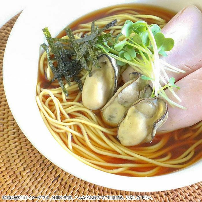 ご家庭でもお鍋ひとつで簡単に本格的なラーメンの味をお楽しみいただけます。麺づくり一筋70余年、「麺が旨い」と評判です!竿掛けした麺線を一昼夜、冷風乾燥させながら素材の旨みやのどごしの良さを引き出す特別製法で仕上げた「半生熟成中華麺」。麺は2種類の一等粉と全卵を使用したのど越しの良い熟成半生麺(中細タイプ)を使用。醤油をベースに広島県産の牡蠣を用いたエキスで風味を引き立て、ポークオイルで味を調えた味わい深いラーメンスープに仕上げています。お好みで牡蠣やハム、海苔などをご用意いただき、トッピングして頂くとより美味しくお召し上がりいただけます。