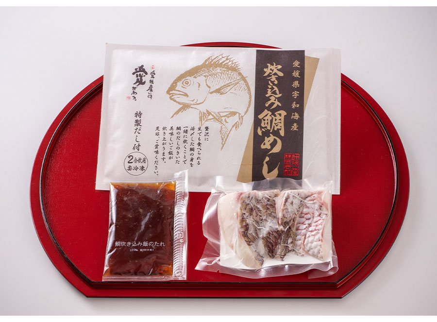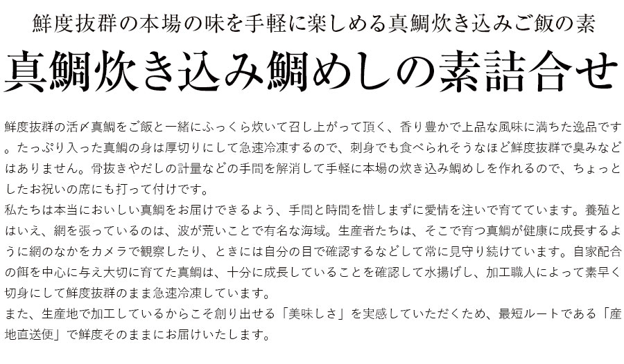 鮮度抜群の活〆真鯛をご飯と一緒にふっくら炊いて召し上がって頂く、香り豊かで上品な風味に満ちた逸品です。たっぷり入った真鯛の身は厚切りにして急速冷凍するので、刺身でも食べられそうなほど鮮度抜群で臭みなどはありません。骨抜きやだしの計量などの手間を解消して手軽に本場の炊き込み鯛めしを作れるので、ちょっとしたお祝いの席にも打って付けです。 私たちは本当においしい真鯛をお届けできるよう、手間と時間を惜しまずに愛情を注いで育てています。養殖とはいえ、網を張っているのは、波が荒いことで有名な海域。生産者たちは、そこで育つ真鯛が健康に成長するように網のなかをカメラで観察したり、ときには自分の目で確認するなどして常に見守り続けています。自家配合の餌を中心に与え大切に育てた真鯛は、十分に成長していることを確認して水揚げし、加工職人によって素早く切身にして鮮度抜群のまま急速冷凍しています。 また、生産地で加工しているからこそ創り出せる「美味しさ」を実感していただくため、最短ルートである「産地直送便」で鮮度そのままにお届けいたします。