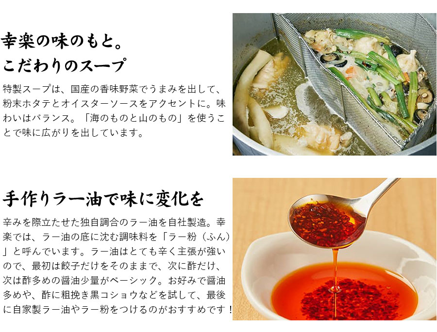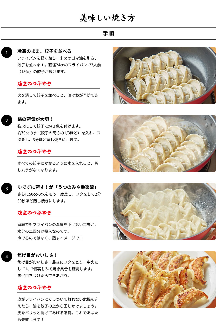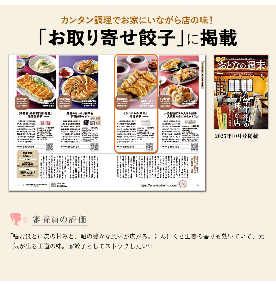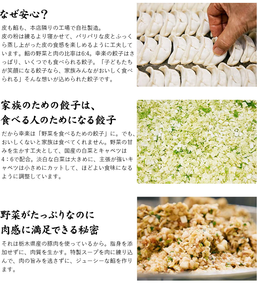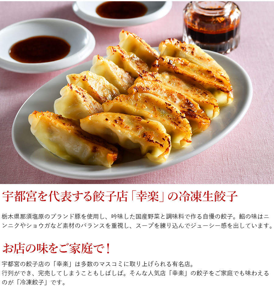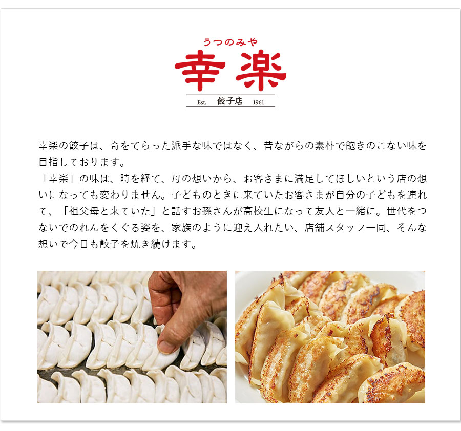 餃子の町宇都宮で長年親しまれた餃子です。特別な調味料は使ってません。年齢問わず美味しく食べていただける味になっております。