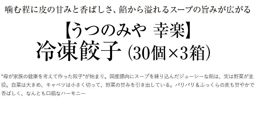 ○名称:幸楽の餃子 ○内容量:30個×3箱(1箱約670g) ○原材料名:皮(小麦粉(国内製造)、ラード)、キャベツ(国産)、白菜(国産)、豚肉、玉ねぎ、ニラ、スープ(鶏がら、豚骨)、豚背油、しょうゆ(小麦、大豆を含む)、砂糖、生姜、ニンニク、塩、オイスターソース、みりん、ごま油、ホタテパウダー、しいたけ粉、こしょう、でんぷん粉 添付タレ(醸造酢、しょうゆ(小麦、大豆を含む)、食用なたね油、唐辛子) 添加物:皮(トレハロース)、調味料(アミノ酸等) ○配送形態:冷凍 (宅配BOX・置配不可) ○保存方法:冷凍 ○賞味期限:製造日より60日 ○熨斗:可 ○名入れ:不可 ○包装:不可 ○手提げ:不可 ○荷姿:ダンボール ○備考:加熱してお召し上がりください ○製造者:【幸楽】 〒320-0061 栃木県宇都宮市宝木町2丁目864-4 <おすすめ用途> 自宅用 手土産 お歳暮 お年賀 お中元 敬老の日 ギフト プレゼント 贈り物 お礼 お返し ご挨拶 結婚祝 内祝い 誕生日 卒業 <贈る相手> 女性 男性 友人 家族 祖母 祖父 孫