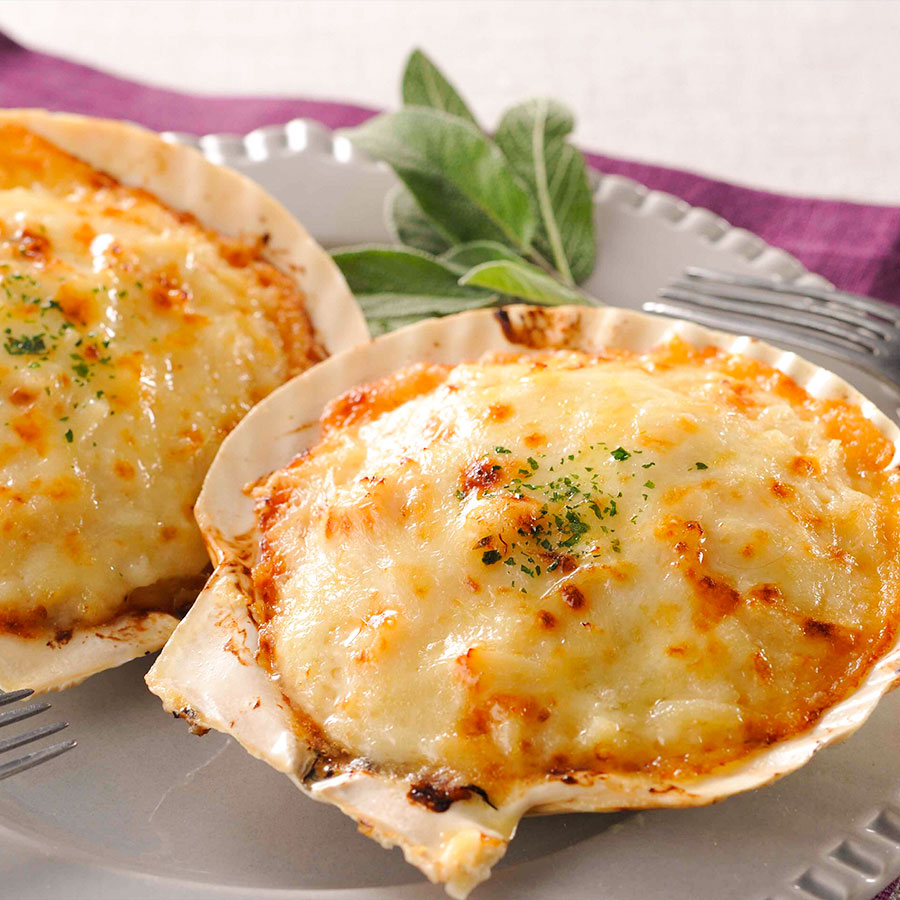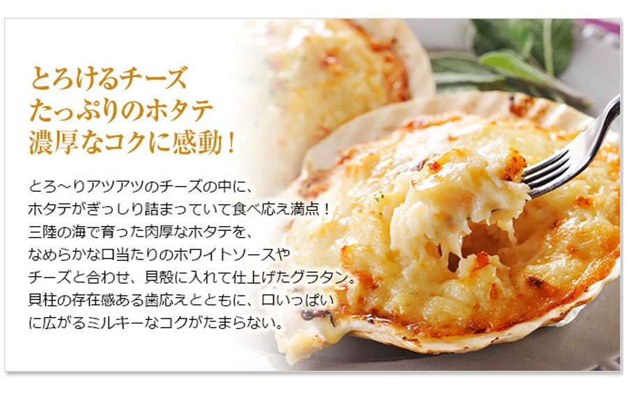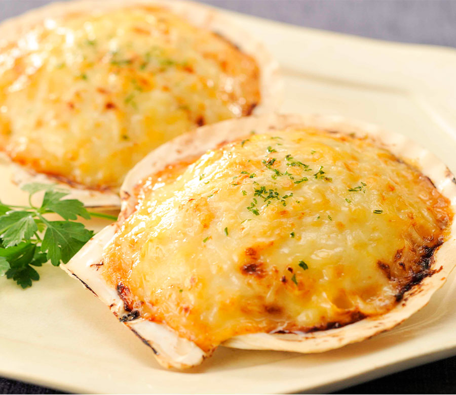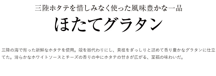 三陸の海で育った新鮮なホタテを使用。殻を器代わりにし、貝柱をぎっしりと詰めて香り豊かなグラタンに仕立てた。滑らかなホワイトソースとチーズの香りの中にホタテの甘さが広がる、至福の味わいだ。