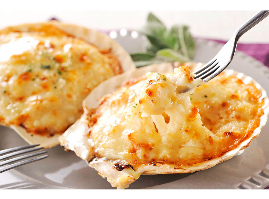 三陸の海で育った新鮮なホタテを使用。殻を器代わりにし、貝柱をぎっしりと詰めて香り豊かなグラタンに仕立てた。滑らかなホワイトソースとチーズの香りの中にホタテの甘さが広がる、至福の味わいだ。
