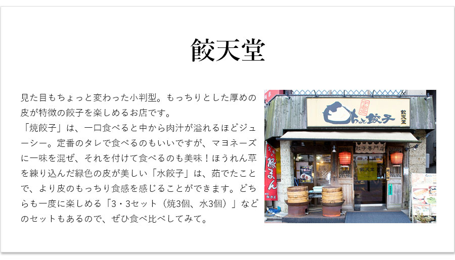 宇都宮餃子の中でも、コロンとした丸形で存在感を放つ焼餃子。もっちりした皮に、キャベツの甘みを抱いた小籠包顔負けのジューシーな肉汁がたっぷり! 定番のタレもいいが、一味マヨを付けて食べるのが店のオススメ。ぜひお試しあれ。